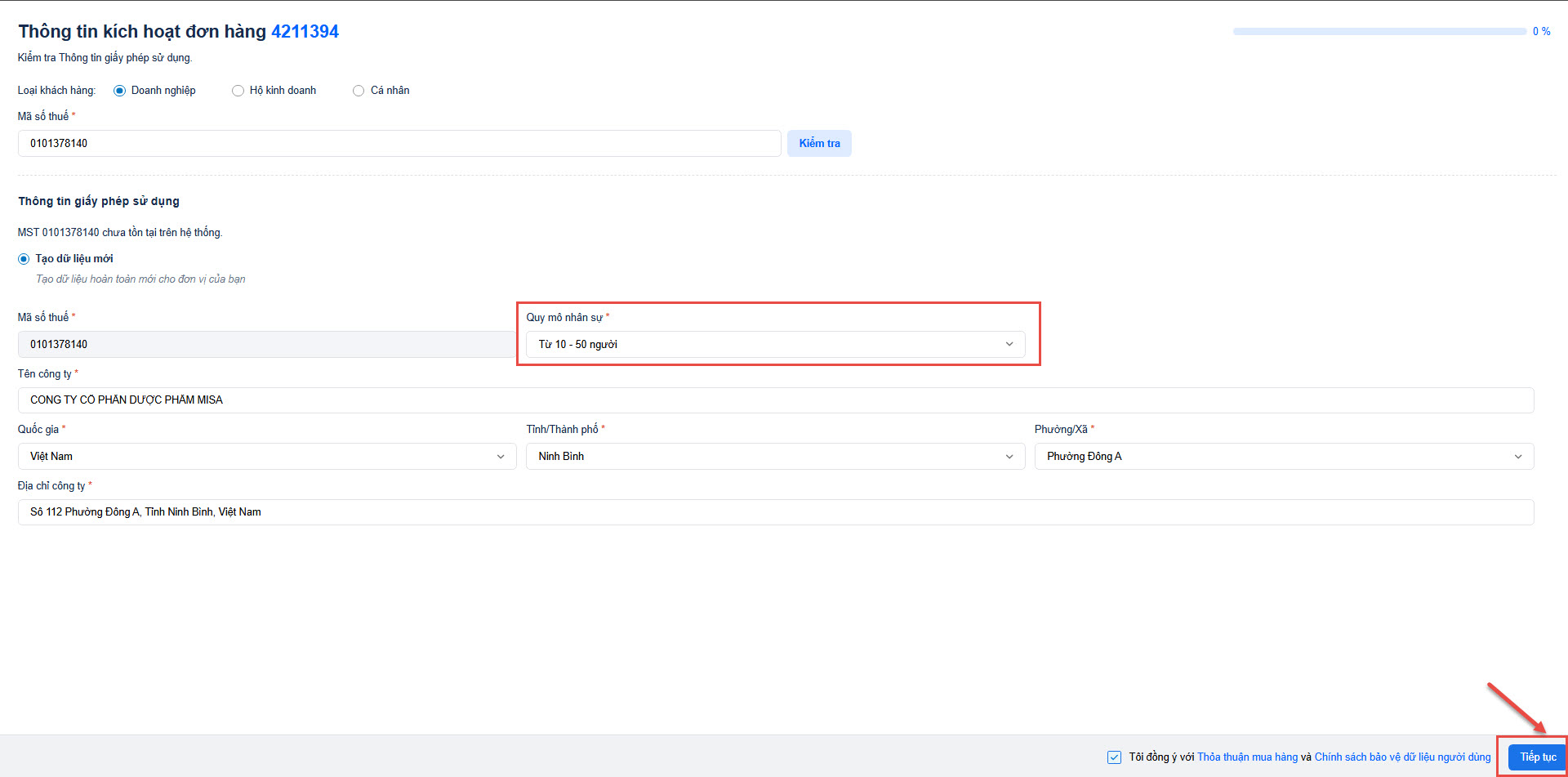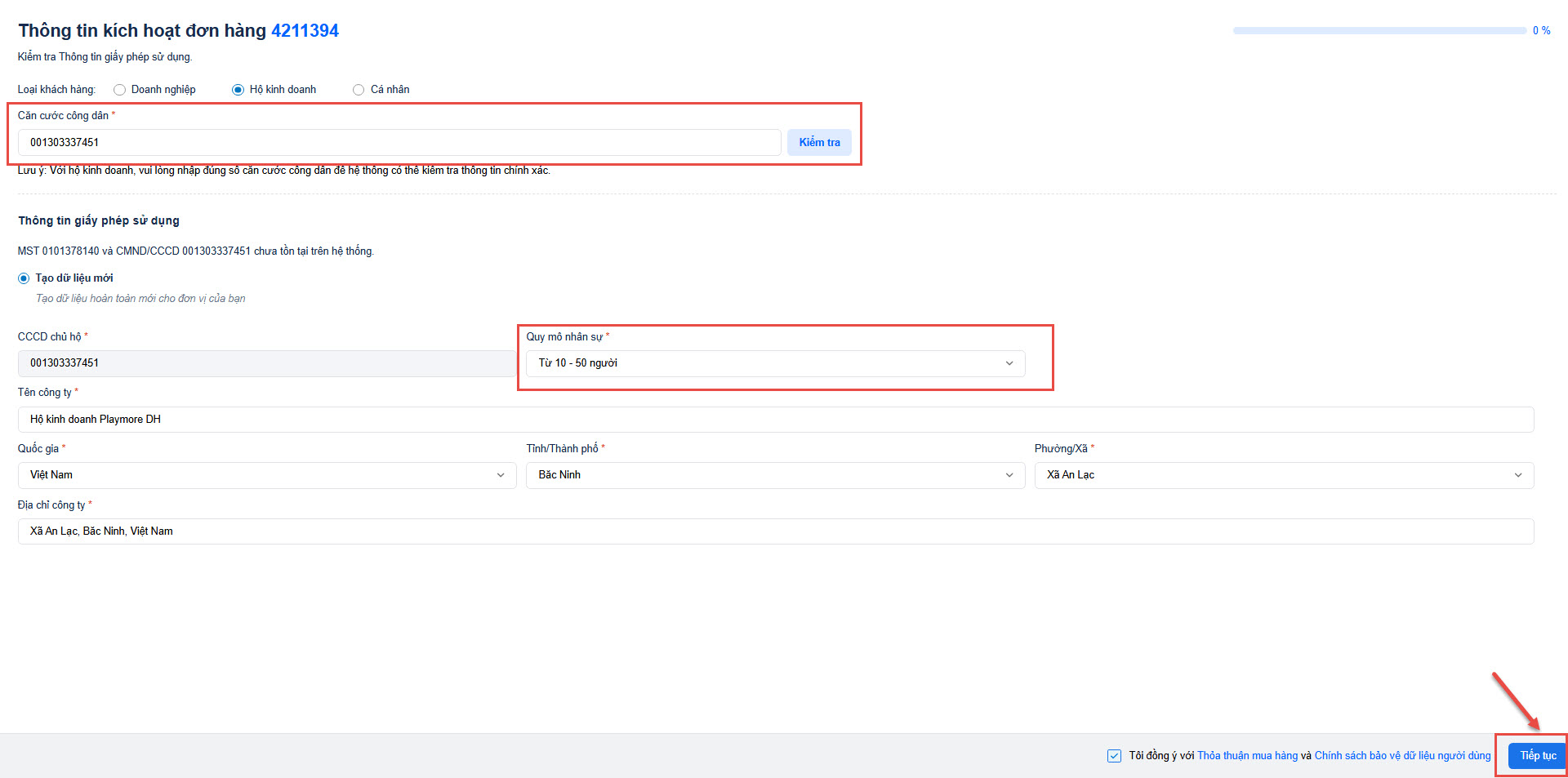 • Tiếp theo, anh/chị nhập Thông tin người đại diện trước pháp luật => nhấn Tiếp tục.