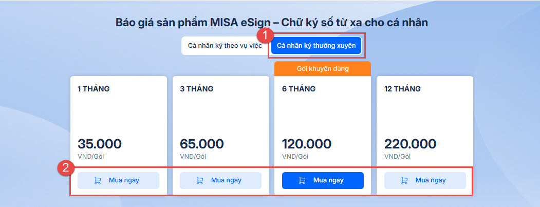 - Sau đó chọn gói chữ ký phù hợp với nhu cầu sử dụng => nhấn Mua ngay.