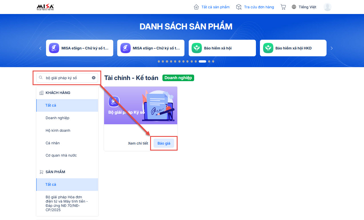 - Anh/chị truy cập MISA Store, tìm kiếm sản phẩm Bộ giải pháp Ký số => nhấn Báo giá.