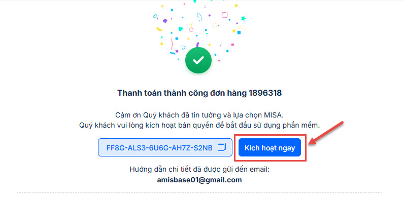 - Anh/chị nhấn Kích hoạt ngay trên màn hình thanh toán thành công (hoặc tin nhắn hướng dẫn kích hoạt được gửi tới email đặt hàng).