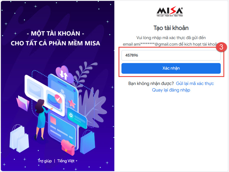 - Sau đó thiết lập tài khoản MISA ID. Hệ thống sẽ gửi mã xác thực về email, anh/chị vui lòng truy cập lấy và nhập mã vào ô trống.