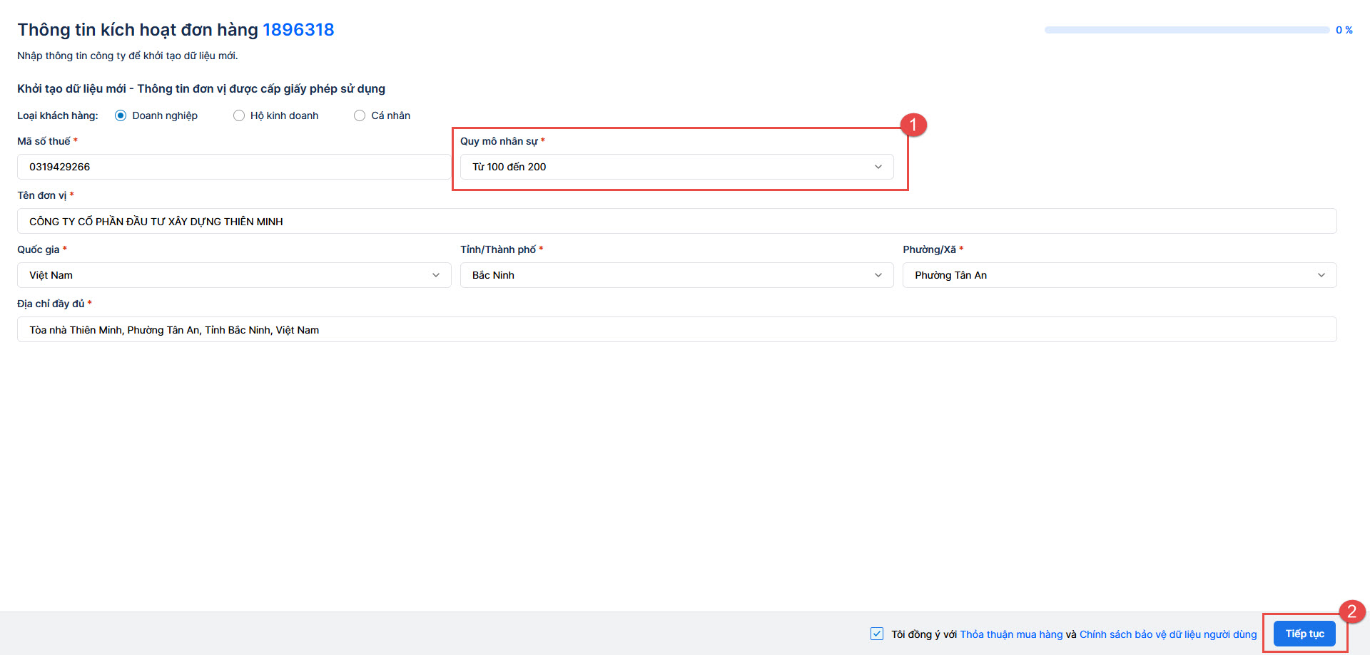 - Quy mô nhân sự => nhấn Tiếp tục.