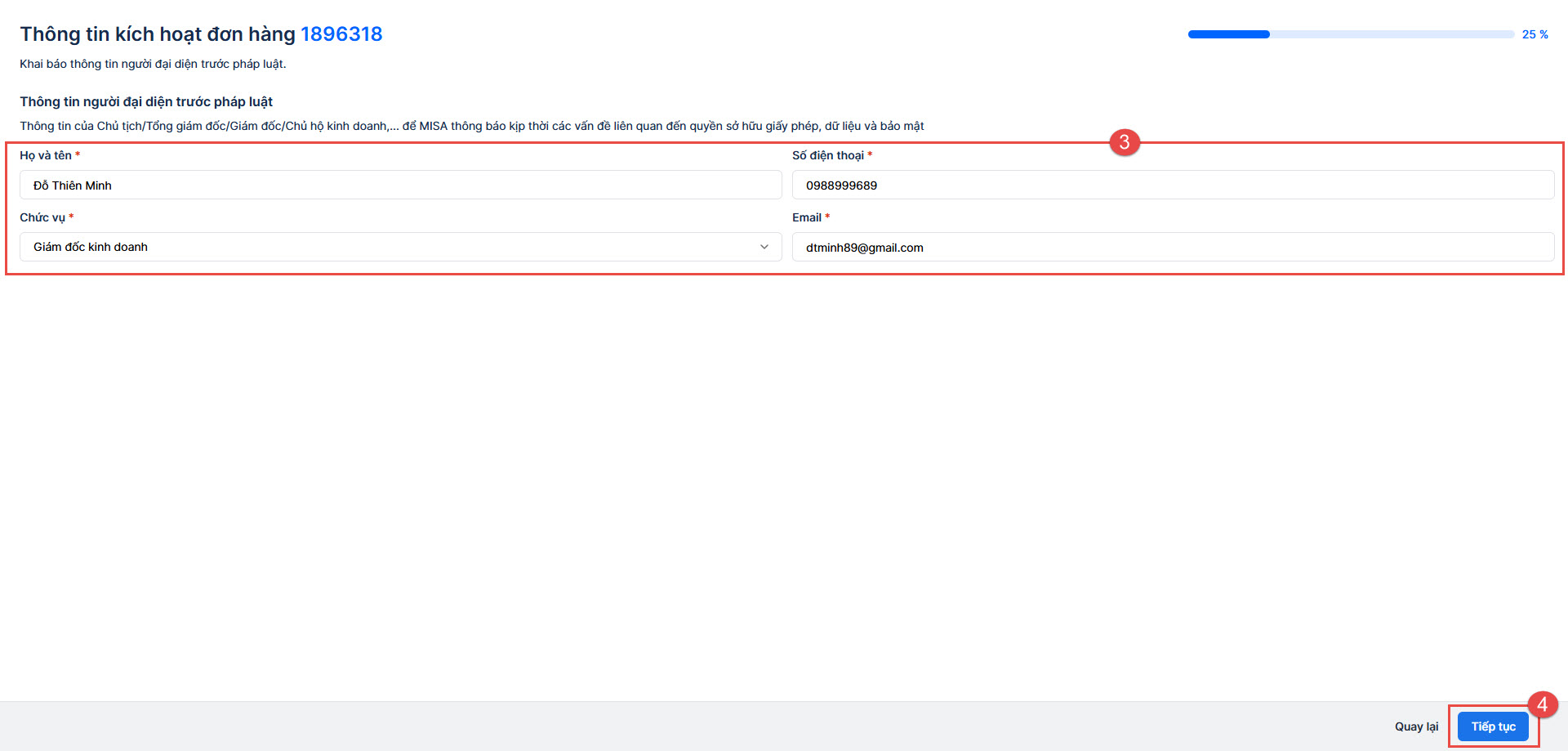 - Thông tin người đại diện trước pháp luật => nhấn Tiếp tục để kích hoạt phần mềm.