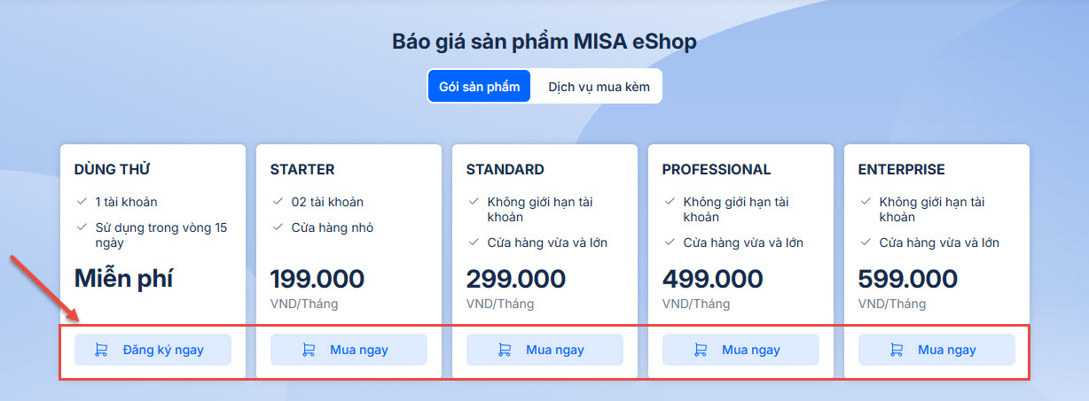 • Tại màn hình báo giá, anh/chị chọn gói phù hợp với nhu cầu sử dụng => nhấn Mua ngay.