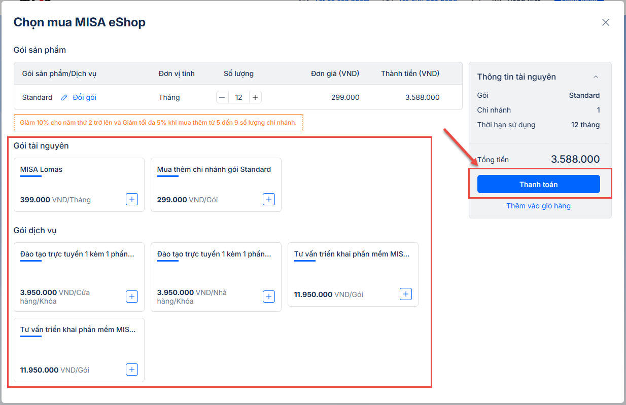• Tại đây, anh/chị có thể chọn mua thêm Gói tài nguyên hoặc Gói dịch vụ, sau đó nhấn Thanh toán.