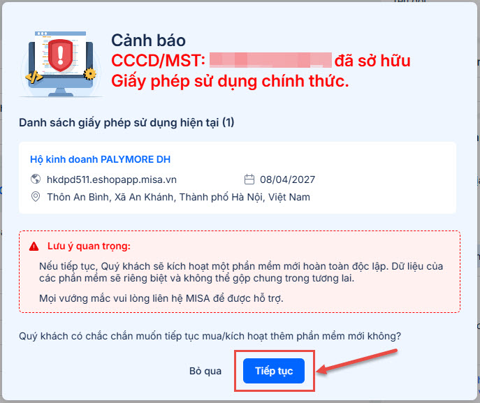 • Trước đây, nếu Khách hàng đã sử dụng CCCD/MST mua GPSD của 1 trong số các phần mềm Hộ kinh doanh (MISA eShop; MISA CUKCUK; Bộ giải pháp Quản lý bán hàng cho Hộ, cá nhân kinh doanh MISA eShop; Bộ giải pháp Quản lý nhà hàng cho Hộ, cá nhân kinh doanh MISA CUKCUK; Bộ giải pháp quản lý nhà hàng; Phần mềm quản lý bán hàng đa kênh MISA eShop) thì khi mua thêm 1 phần mềm khác, hệ thống MISA sẽ hiển thị cảnh báo và KHÔNG cho phép anh/chị tiếp tục mua.