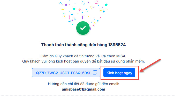 • Sau khi thanh toán thành công, anh/chị thực hiện kích hoạt tại thông báo trên màn hình hoặc thực hiện theo hướng dẫn kích hoạt đã được gửi qua Email.