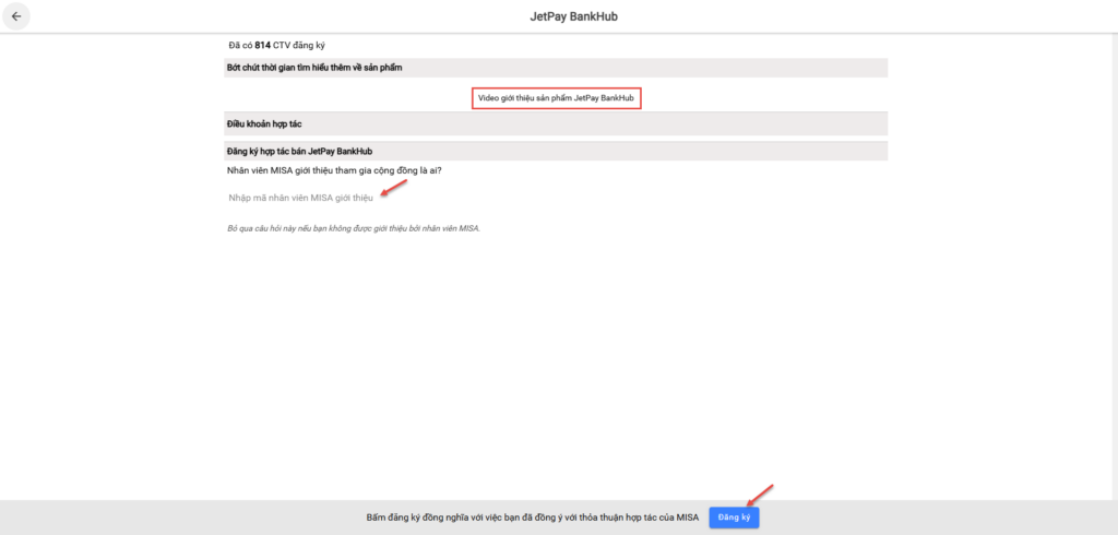 - Nếu điền mã nhân viên của nhân viên kinh doanh MISA thuộc phòng quản lý chính sách mạng lưới doanh nghiệp giới thiệu bạn tham gia cộng đồng, gói đăng ký JetPay BankHub này sẽ được ghi nhận cho nhân viên đó.