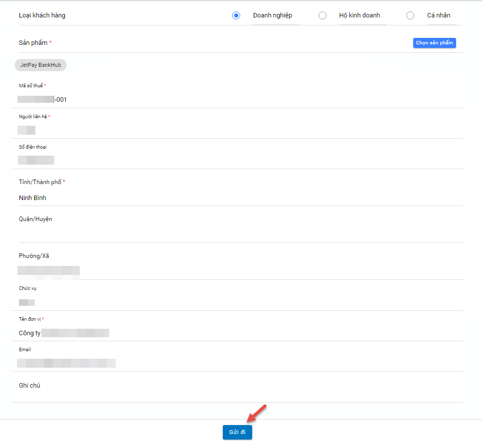 - Tại đây, nhập đầy đủ thông tin về khách hàng và nhấn chọn Gửi đi và nhấn OK để tiếp tục.