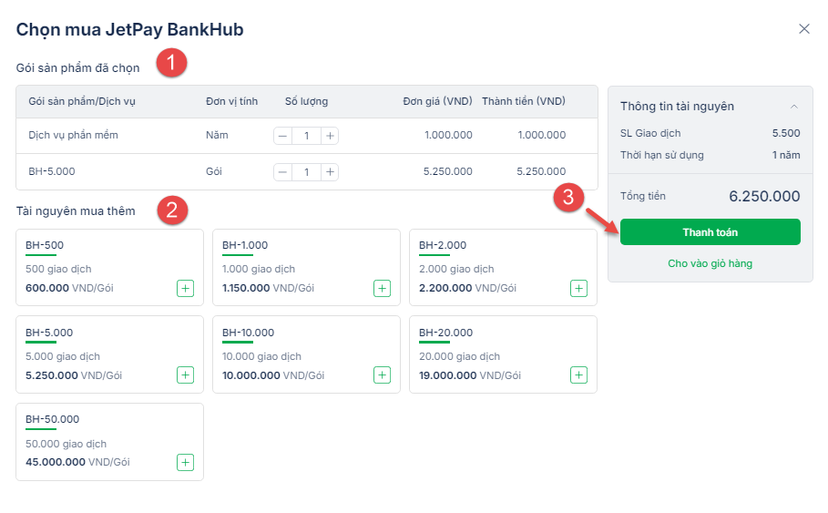 - Kiểm tra lại gói sản phẩm đã chọn, lựa chọn thêm Tài nguyên mua thêm (nếu cần) và nhấn Thanh toán.