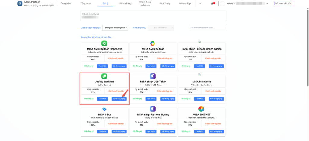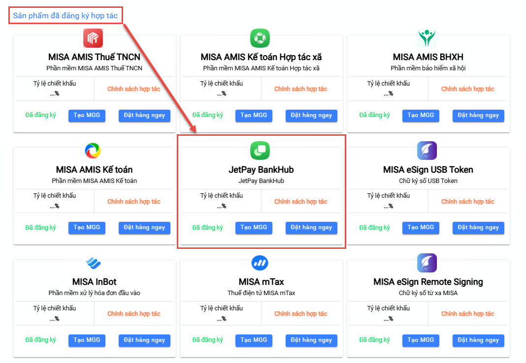 Sau khi MISA duyệt đăng ký hợp tác này, sản phẩm JetPay Bankhub sẽ hiển thị trong Sản phẩm đã đăng ký hợp tác, lúc này, bạn có thể lên đơn đặt hàng sản phẩm cho khách hàng.