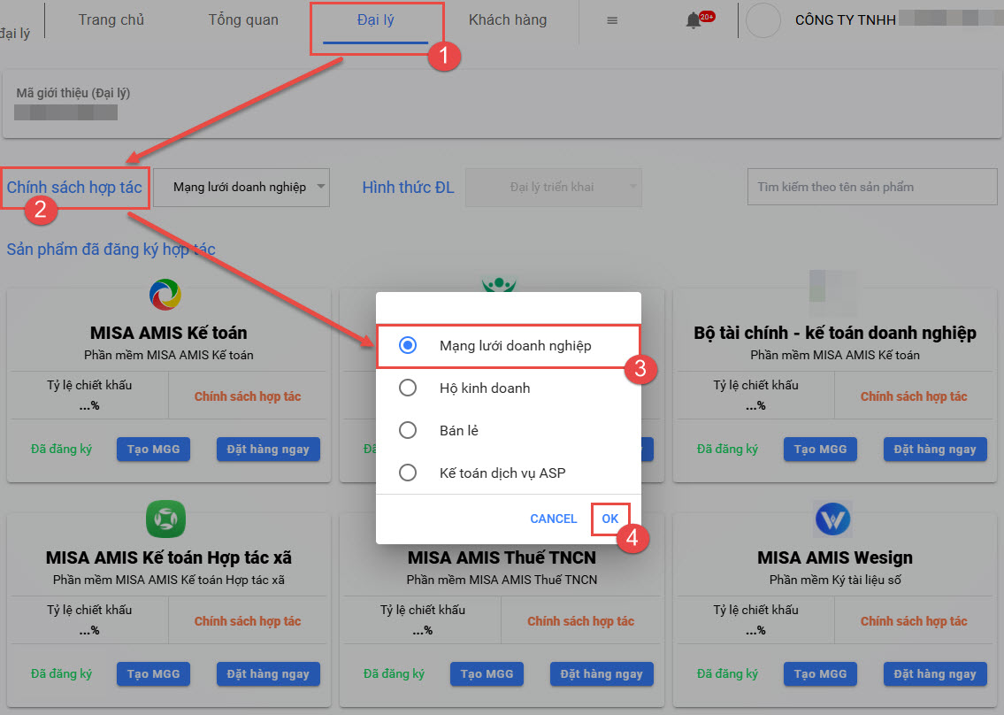 - Bạn truy cập vào MISA Partner, phân hệ Đại lý/Chính sách hợp tác/Mạng lưới doanh nghiệp/OK để tiếp tục.