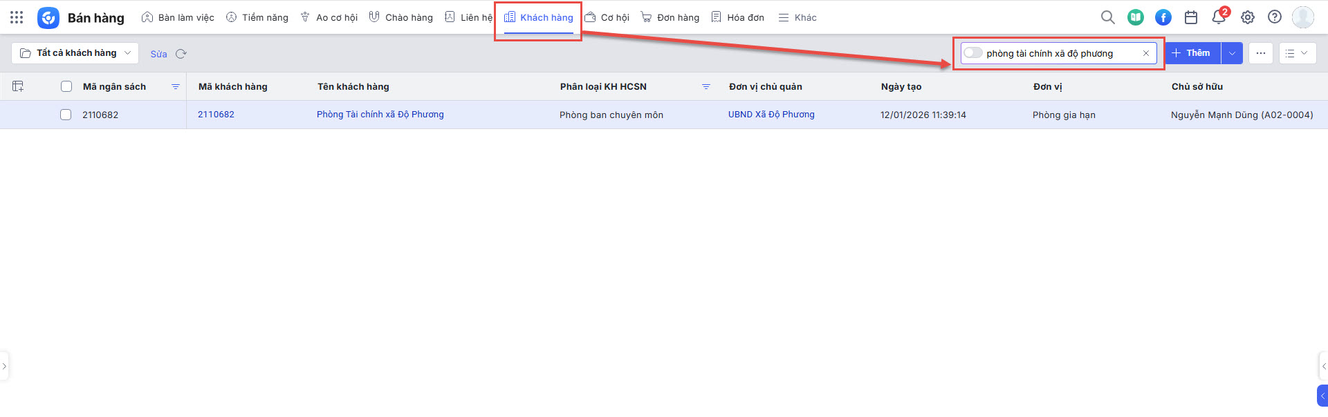 Bước 1: Tạo Khách hàng là đối tượng HCSN cấp Xã/Phường trên CRM