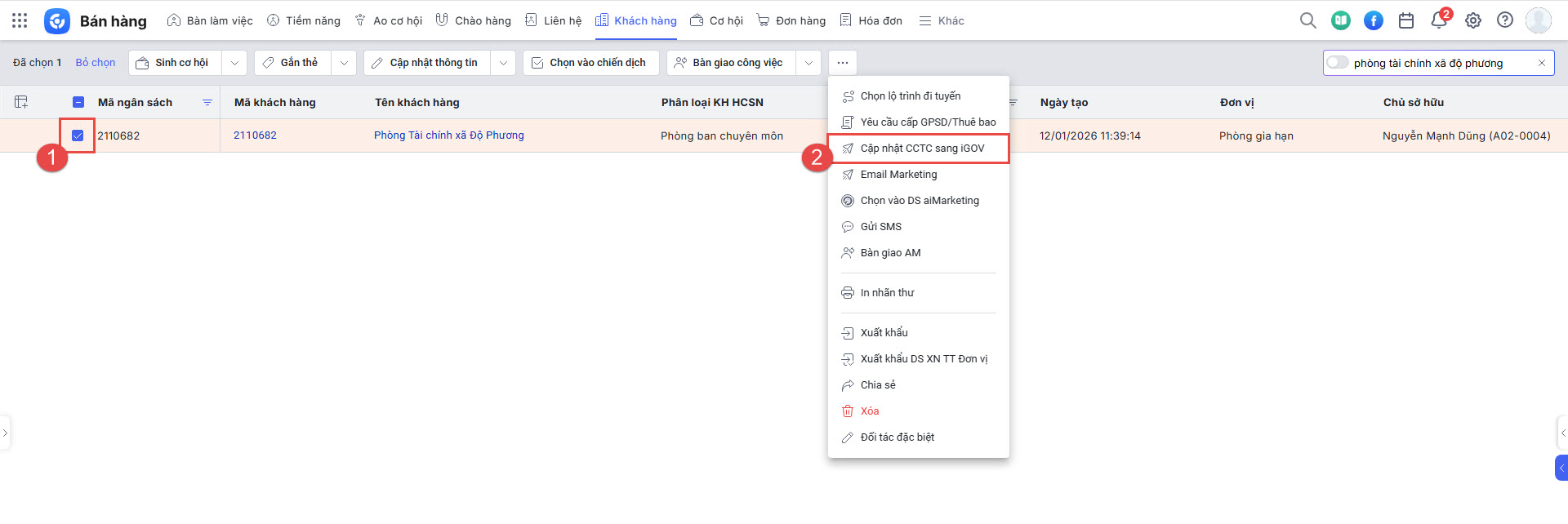 - Tại dòng thông tin khách hàng, anh/chị tích chọn Checkbox, sau đó chọn Cập nhật CCTC sang iGOV.