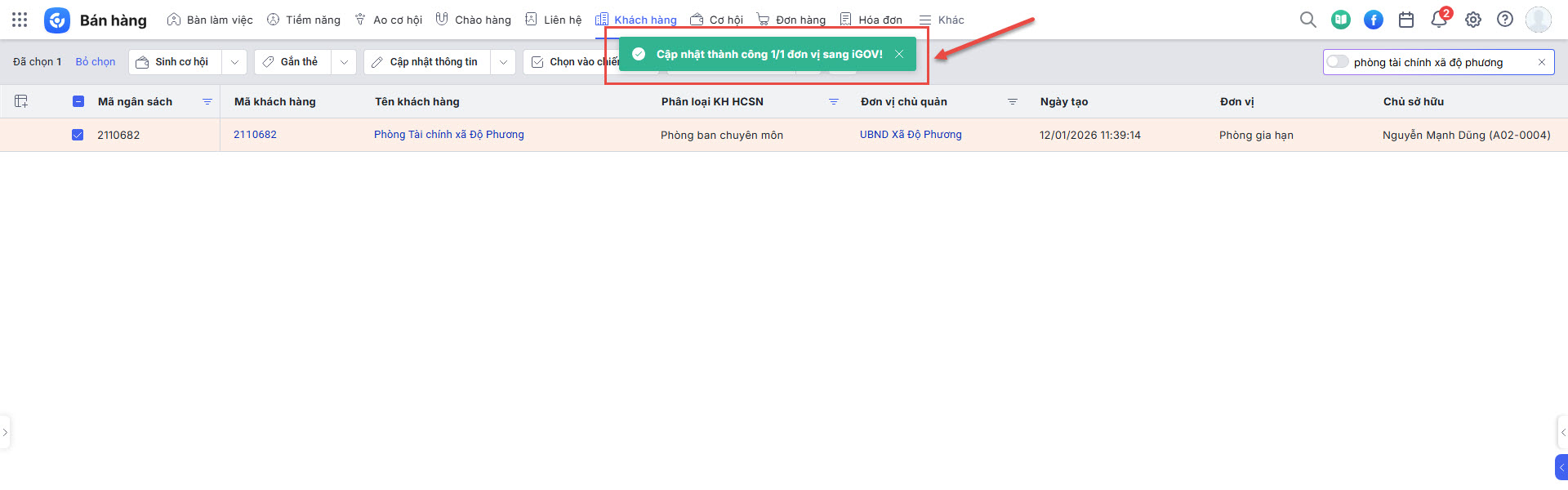 - Hệ thống cập nhật thành công, đơn vị trực thuộc mới có thể sử dụng các sản phẩm iGOV của UBND Xã/Phường.