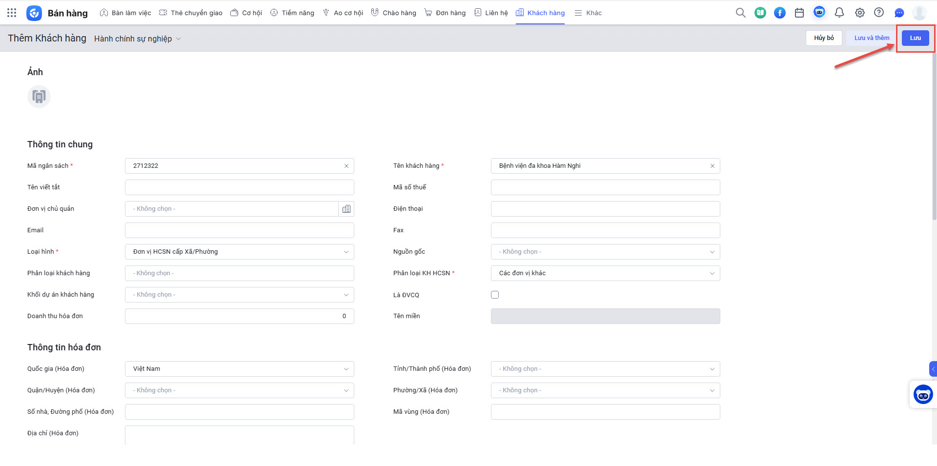 Bước 1: Tạo Khách hàng HCSN là bệnh viện trên CRM