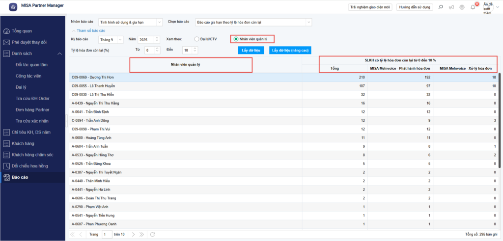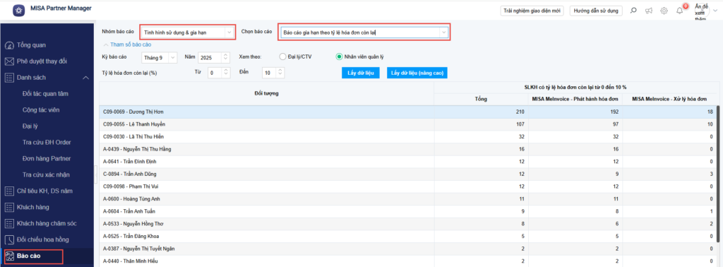 - Tại Partner Manager, chọn phân hệ Báo cáo/Tình hình sử dụng và gia hạn.