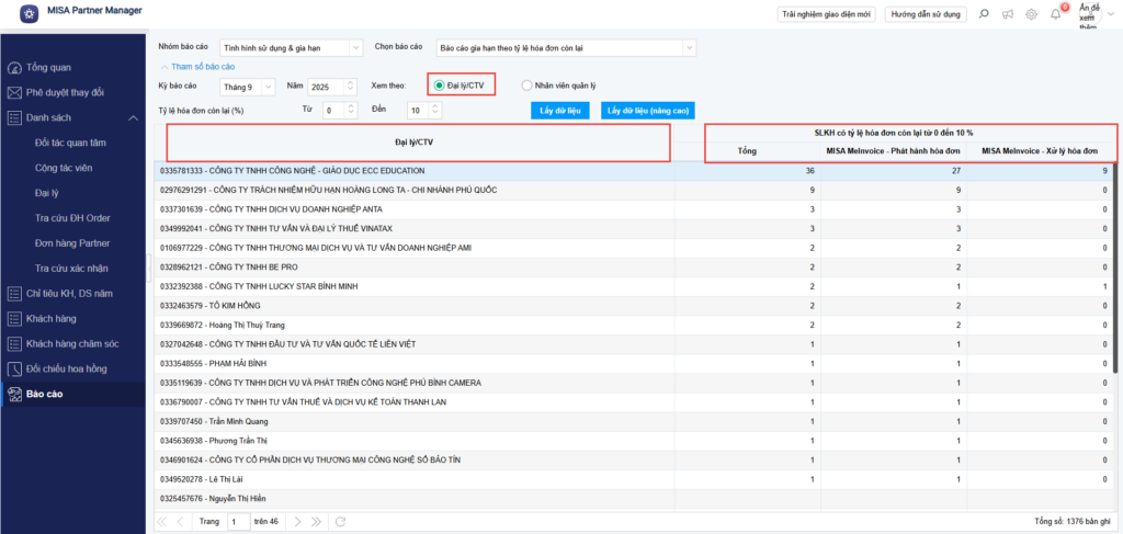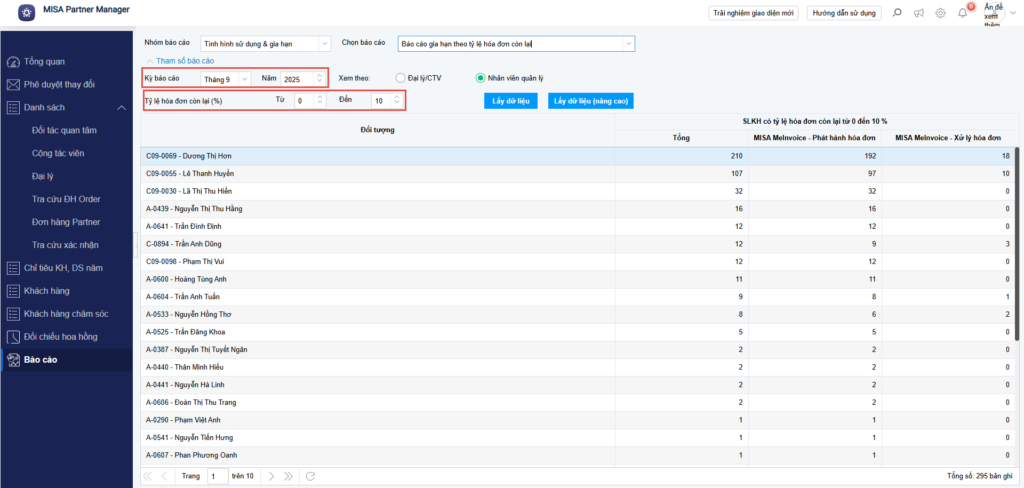 - Kỳ báo cáo: Chọn để hiển thị danh sách KH có tỷ lệ hóa đơn: