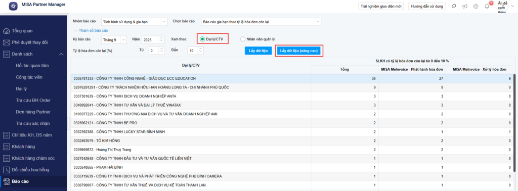 - Để tìm kiếm chi tiết 1 hoặc 1 số Đại lý/CTV, chọn Lấy dữ liệu (nâng cao).