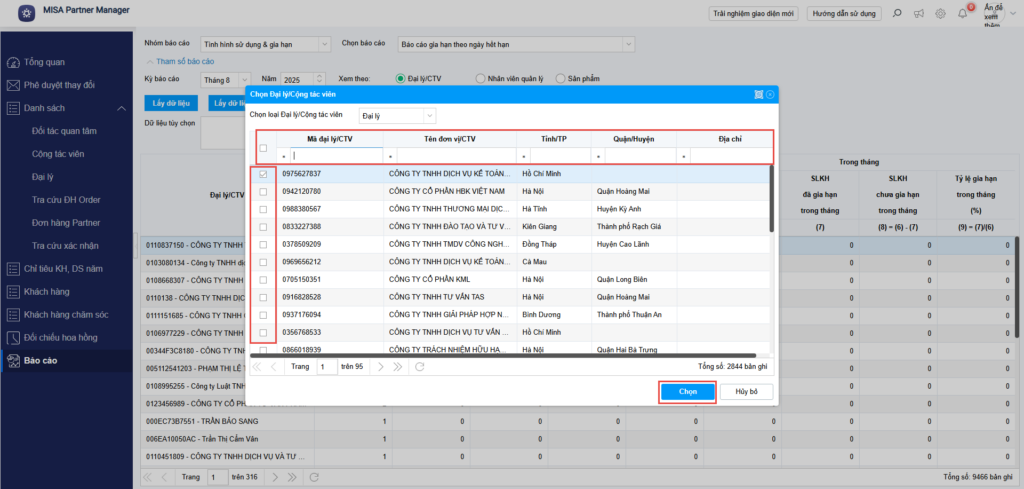 - Tìm kiếm Đại lý/CTV theo Mã Đại lý/CTV, Tên Đại lý/CTV, tích chọn nhiều nếu muốn, sau đó ấn chọn để theo dõi tình trạng gia hạn.