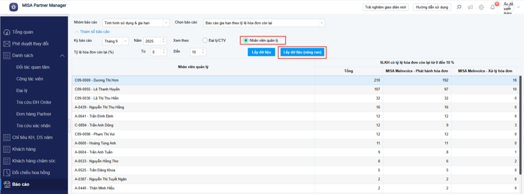 - Để tìm kiếm chi tiết 1 hoặc 1 số Nhân viên kinh doanh, chọn Lấy dữ liệu (nâng cao).