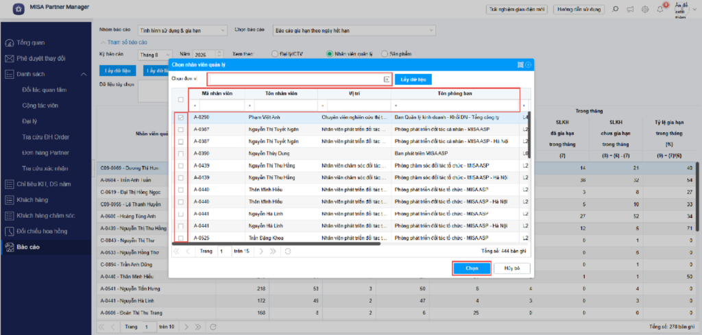 - Tìm kiếm Nhân viên kinh doanh theo Đơn vị, Mã nhân viên, Tên nhân viên…, tích chọn nhiều nếu muốn, sau đó ấn chọn để theo dõi tình trạng gia hạn.