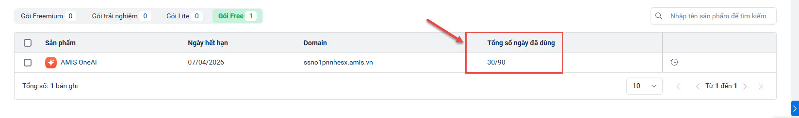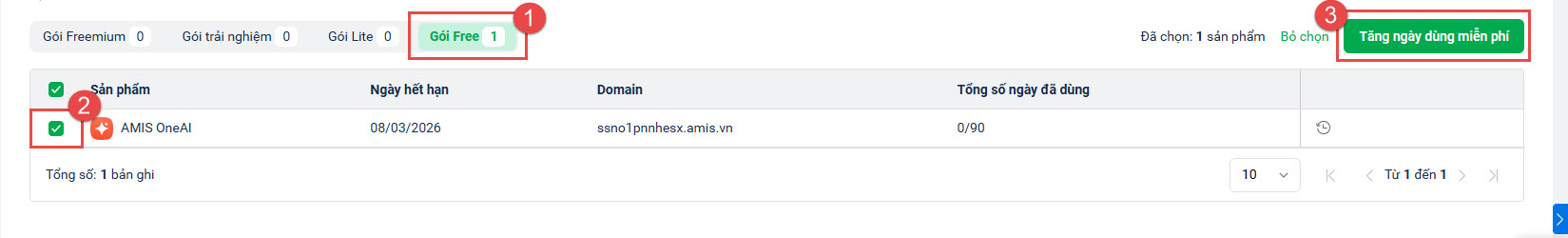 • Tìm kiếm thành công, tại tab Gói Free, anh/chị tick chọn sản phẩm OneAI => nhấn Tăng ngày dùng miễn phí.