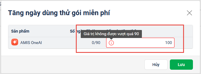 • Nếu chọn số ngày tăng thêm > 90 ngày, hệ thống sẽ cảnh báo, nếu anh/chị nhấn Lưu => hệ thống tự động điều chỉnh số ngày tăng thêm về 90 ngày.