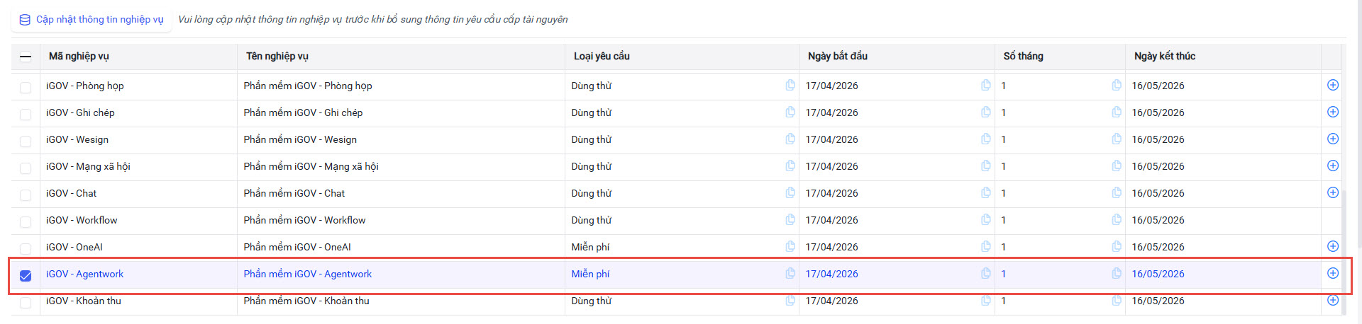 - Tick chọn nghiệp vụ iGOV Agentwork.