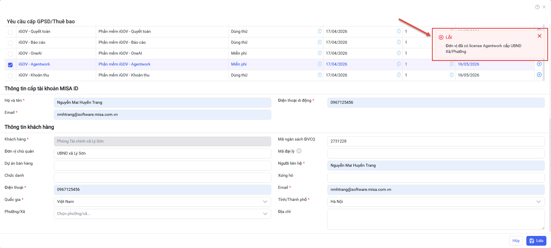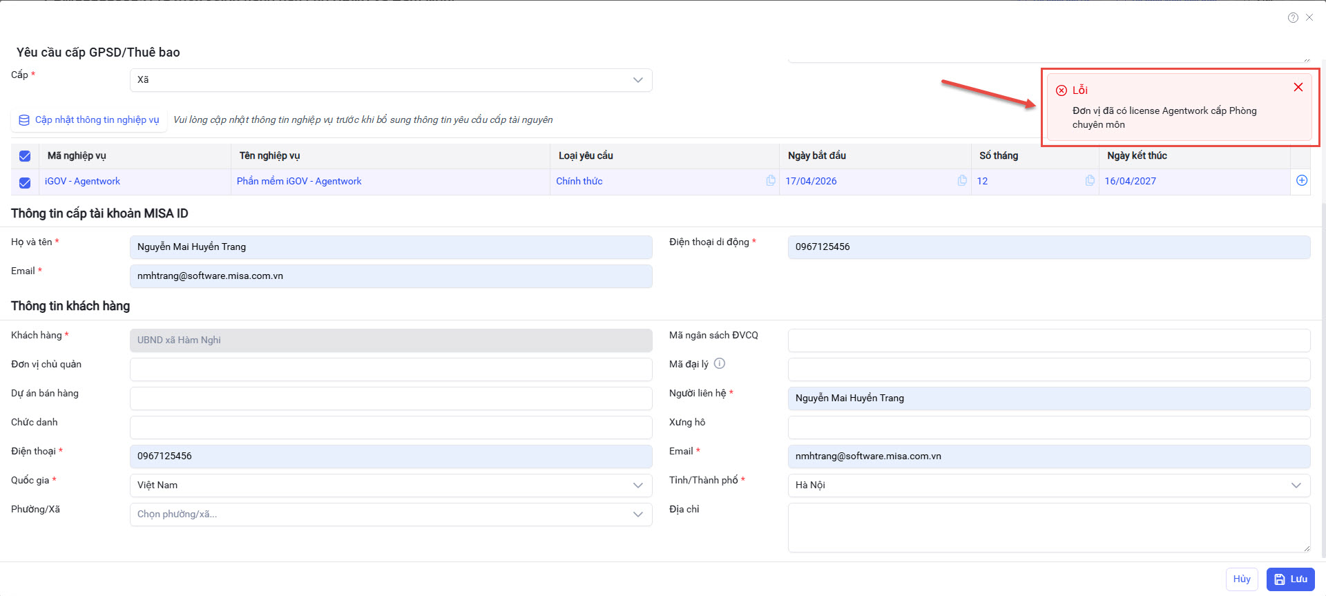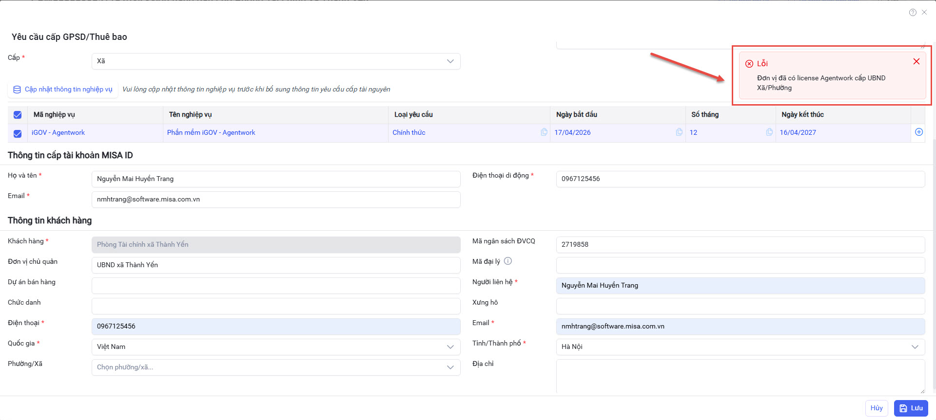 - Nếu UBND Xã/Phường có đơn vị trực thuộc là Phòng ban chuyên môn và Phòng ban chuyên môn đó đã có GPSD Agentwork (miễn phí và trả phí) => Hệ thống sẽ hiển thị cảnh báo và không thực hiện cấp GPSD/Thuê bao nữa.