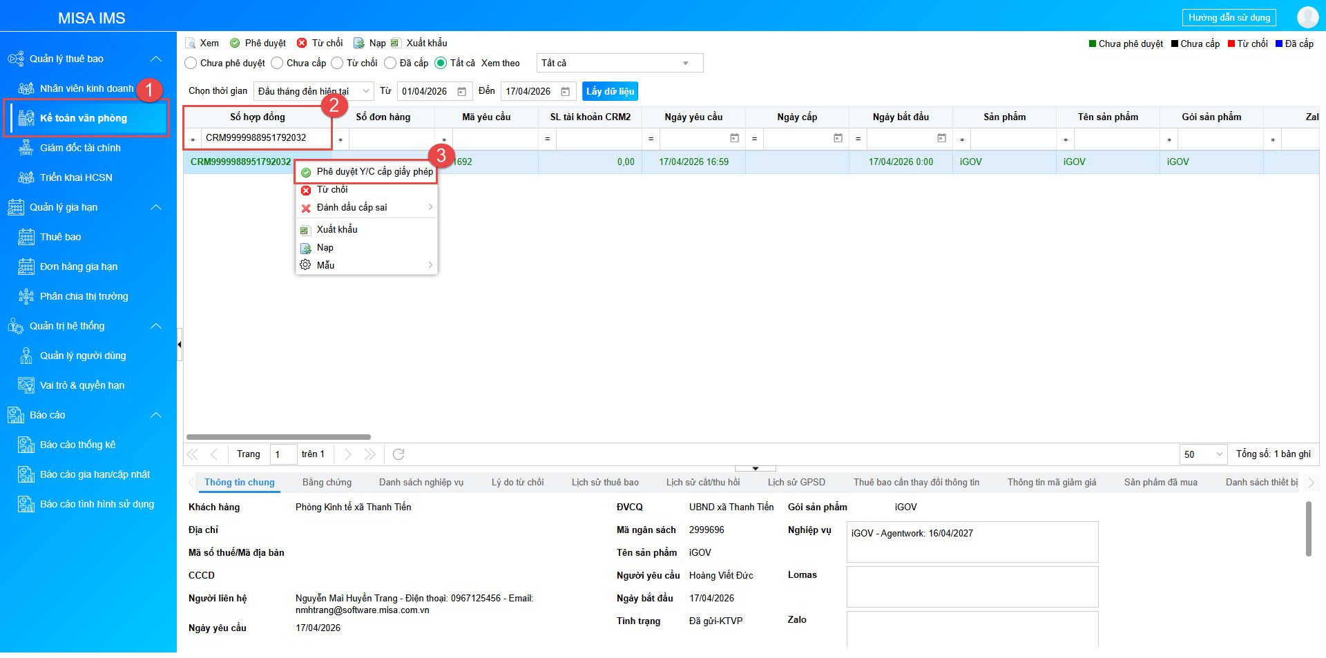 Lưu ý: Khác với một số sản phẩm khác được phê duyệt tự động dựa trên giá trị đơn hàng và bằng chứng cấp nguồn, mọi yêu cầu cấp GPSD/thuê bao cho iGOV đều cần được Kế toán văn phòng xét duyệt thủ công.
