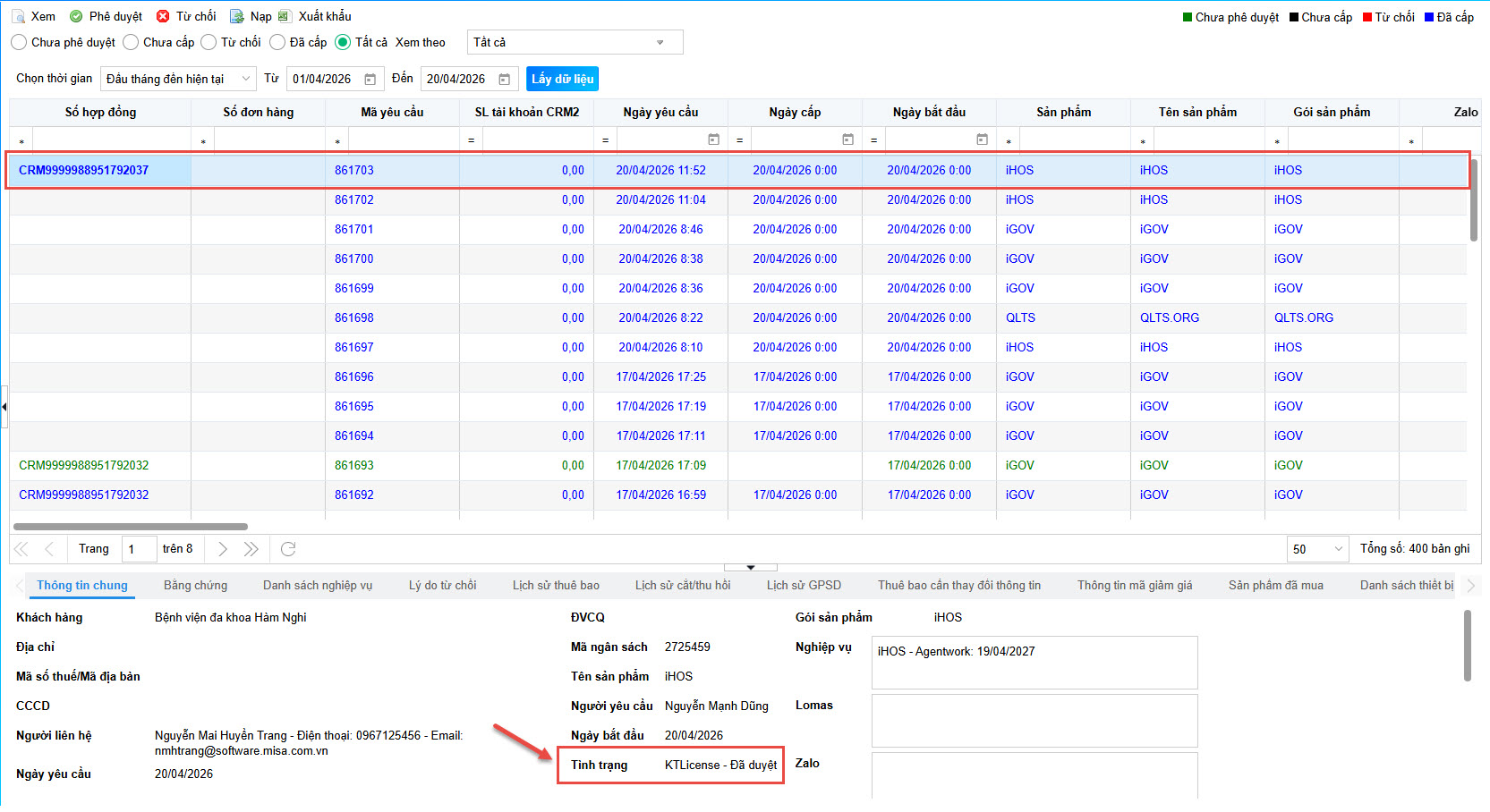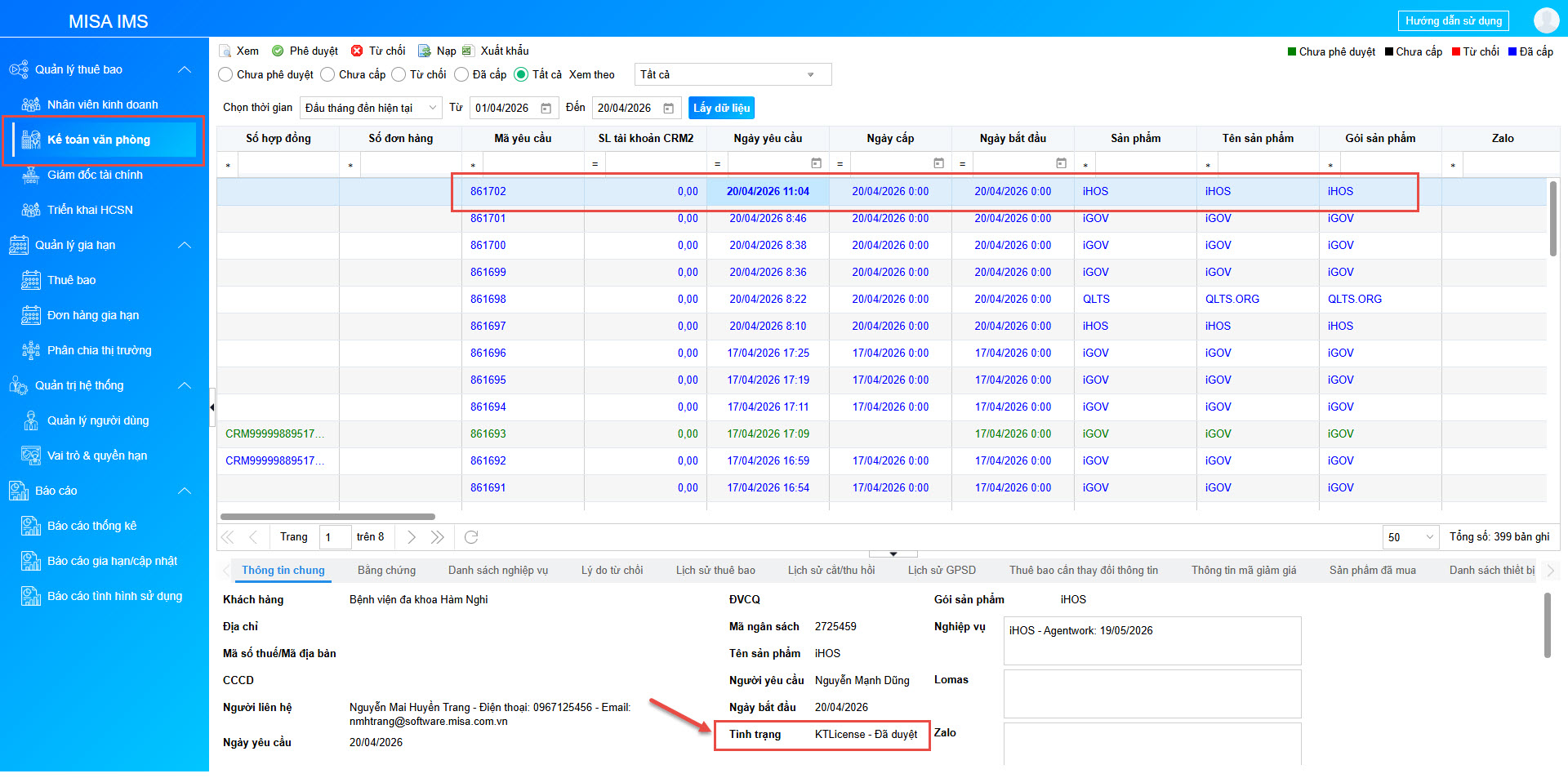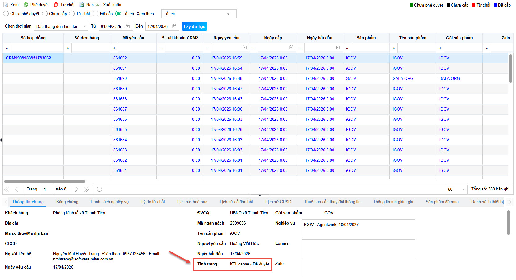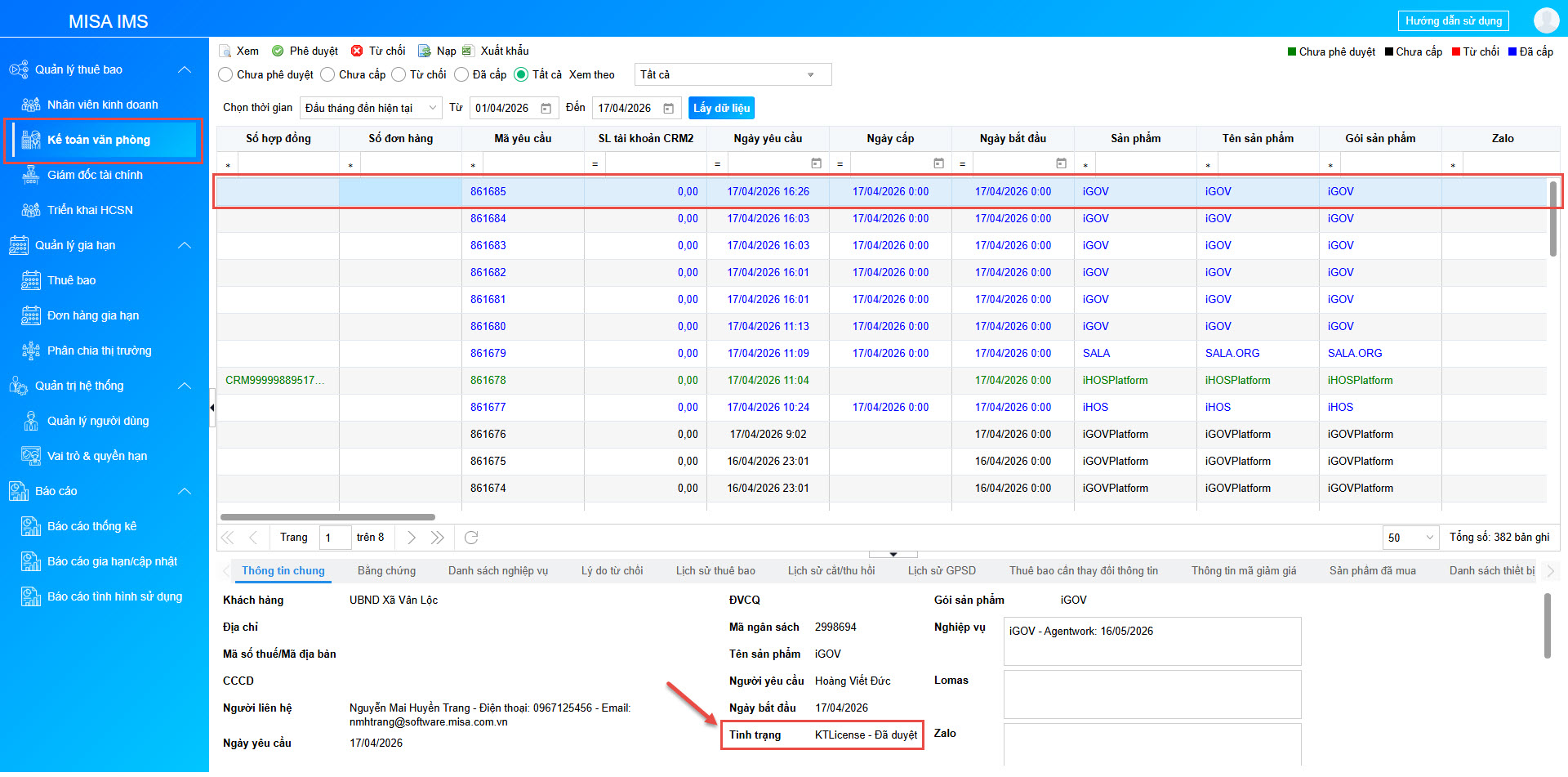 - Phê duyệt thành công, trong Thông tin chung của thuê bao sẽ hiển thị chi tiết các nghiệp vụ đã cấp thuê bao, Tình trạng đơn hàng sẽ chuyển thành KTLicense – Đã duyệt.