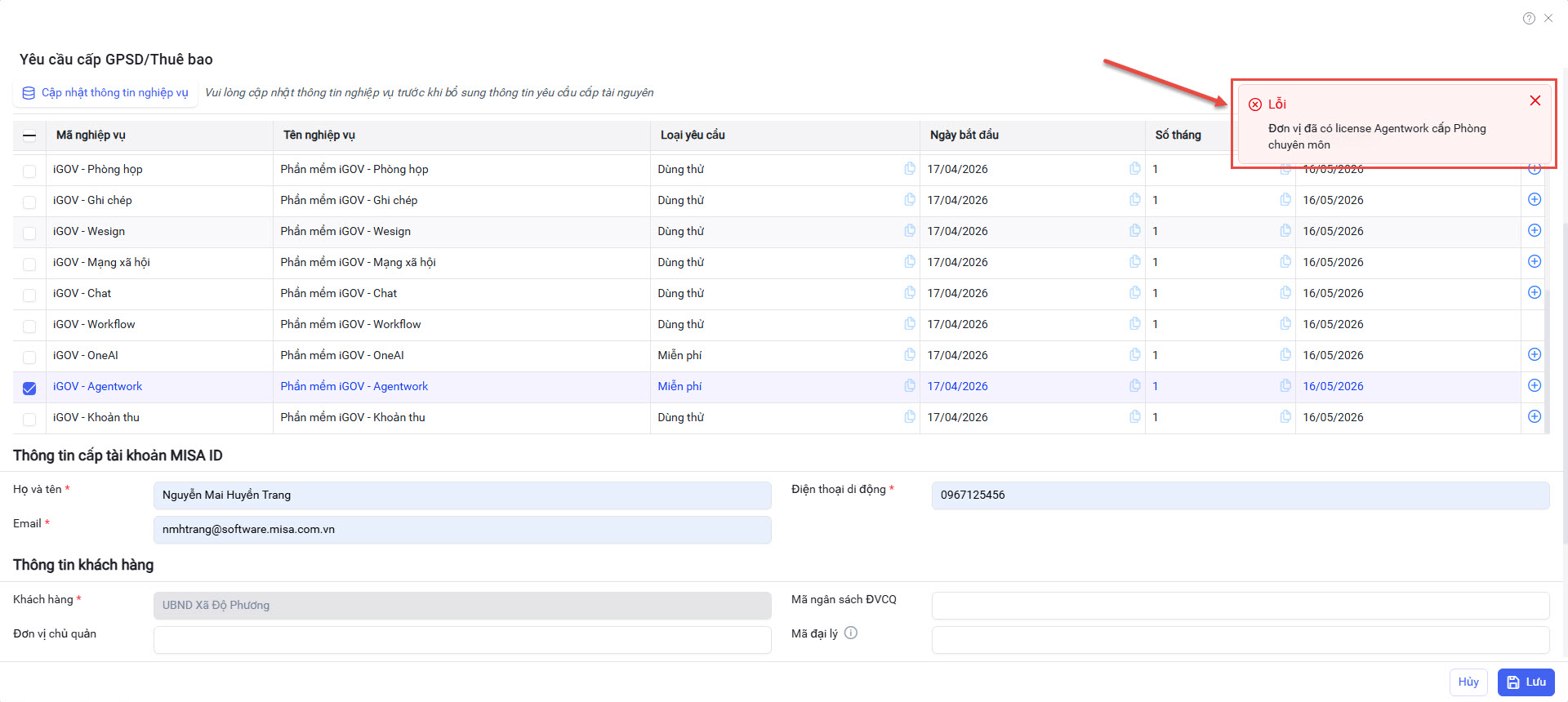- Nếu Phòng ban chuyên môn có đơn vị chủ quản là UBND Xã/Phường và UBND đó đã có GPSD Agentwork (miễn phí và trả phí) => Hệ thống sẽ hiển thị cảnh báo và không thực hiện cấp GPSD/Thuê bao nữa.