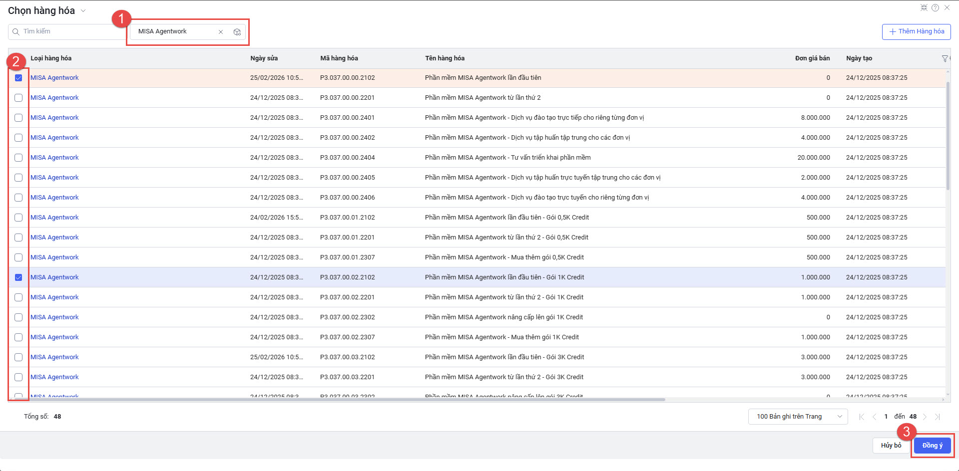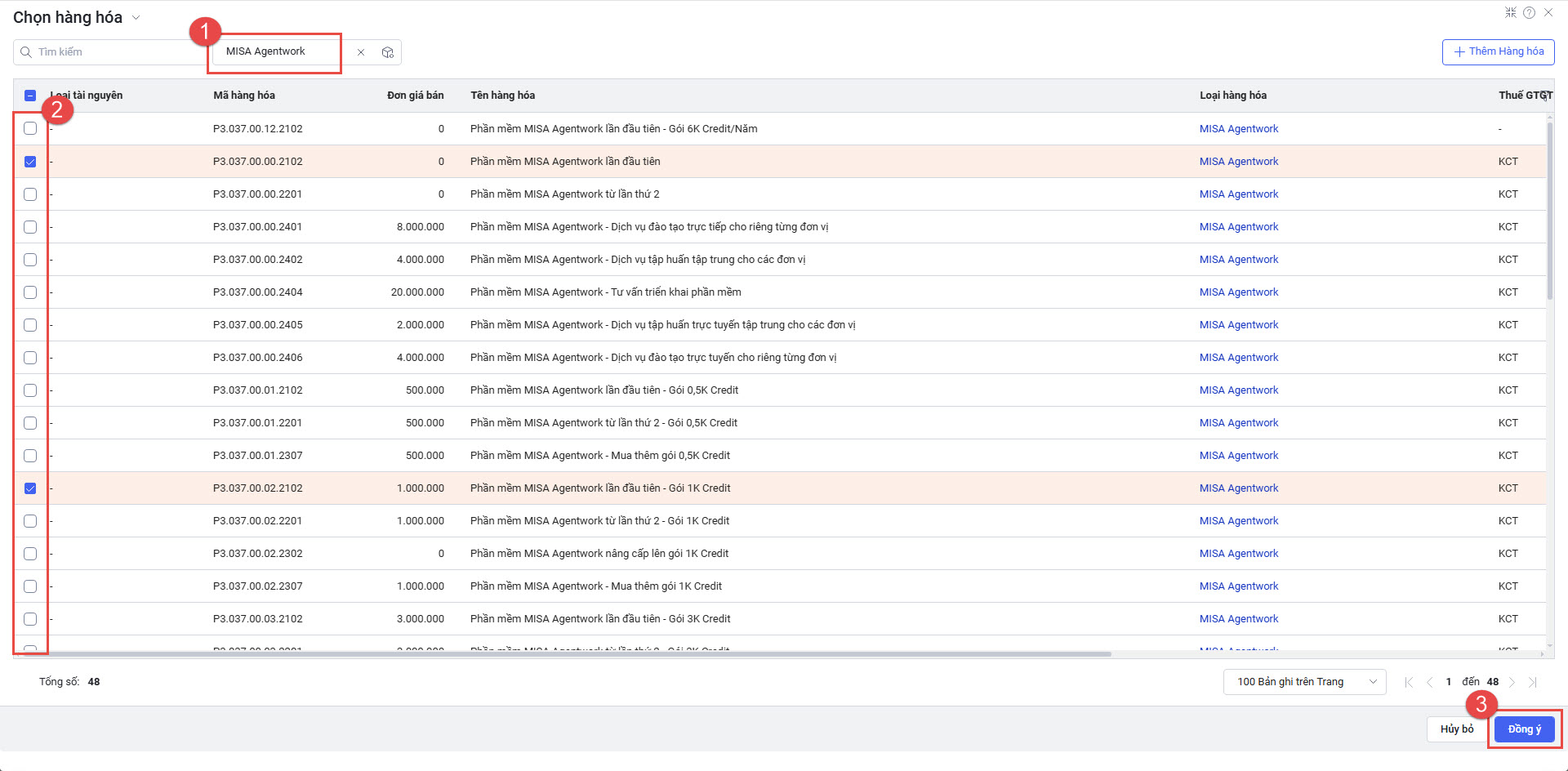 - Tìm kiếm sản phẩm MISA Agentwork, tích chọn mã hàng hóa cần mua và nhấn Đồng ý.