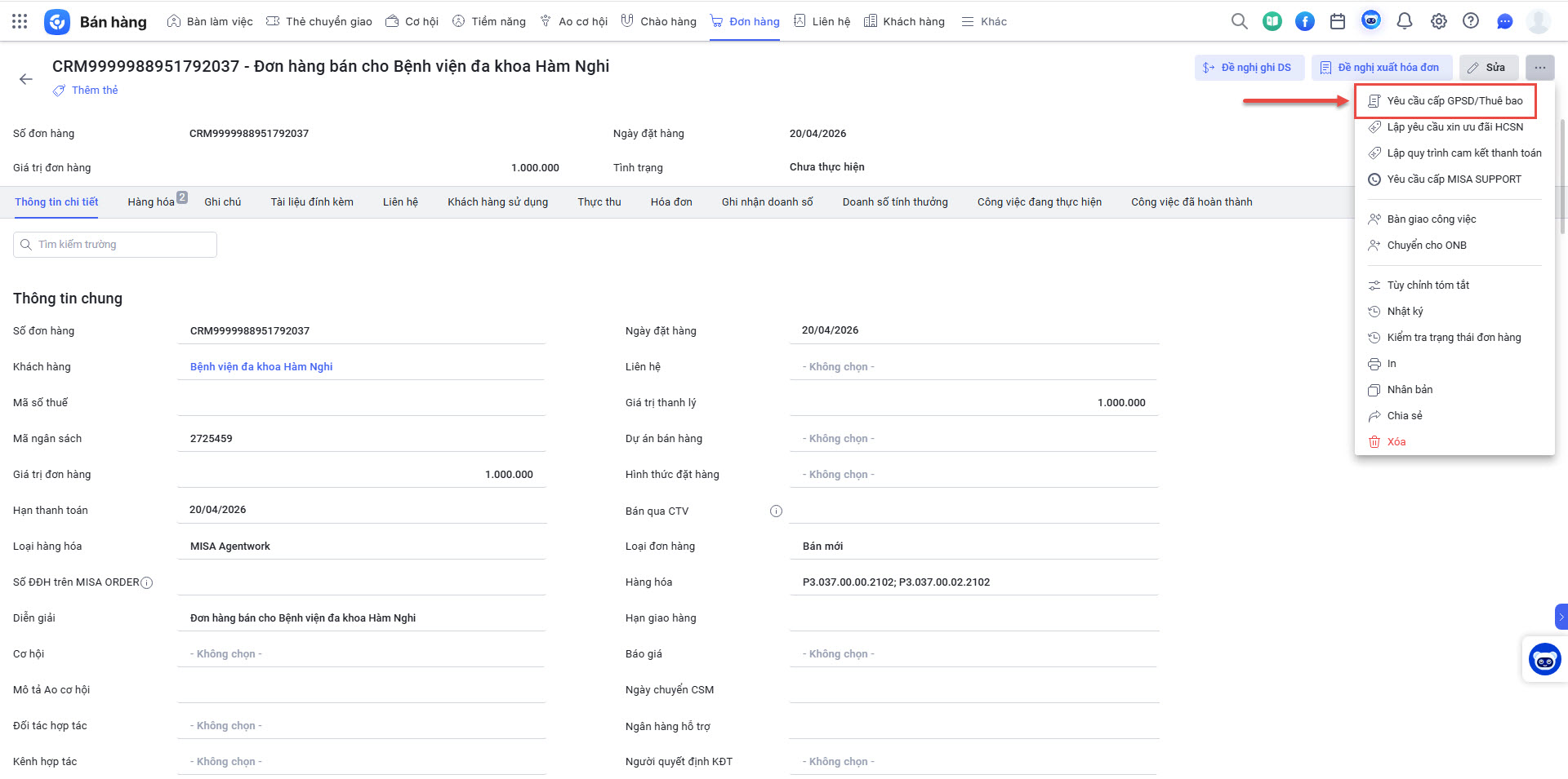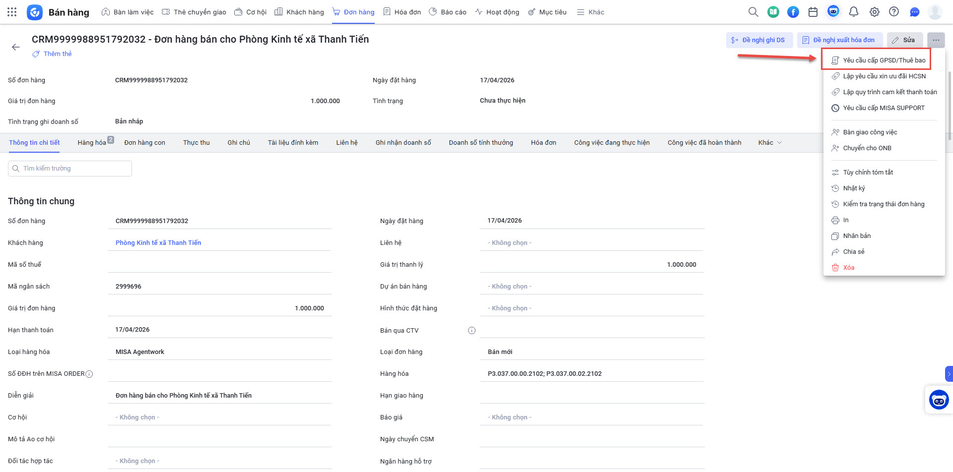 - Trên màn hình thông tin của đơn hàng vừa tạo, nhấn vào menu chức năng và chọn Yêu cầu cấp GPSD/Thuê bao.