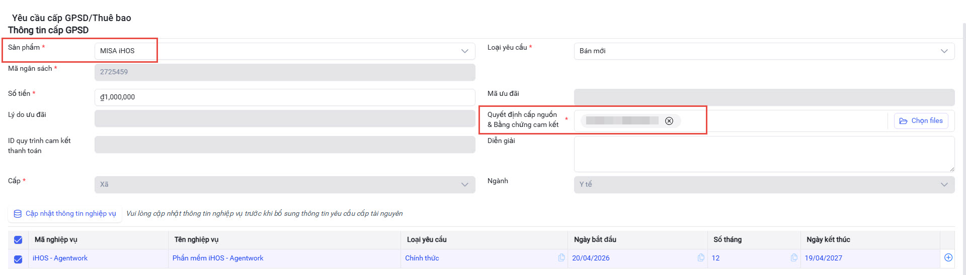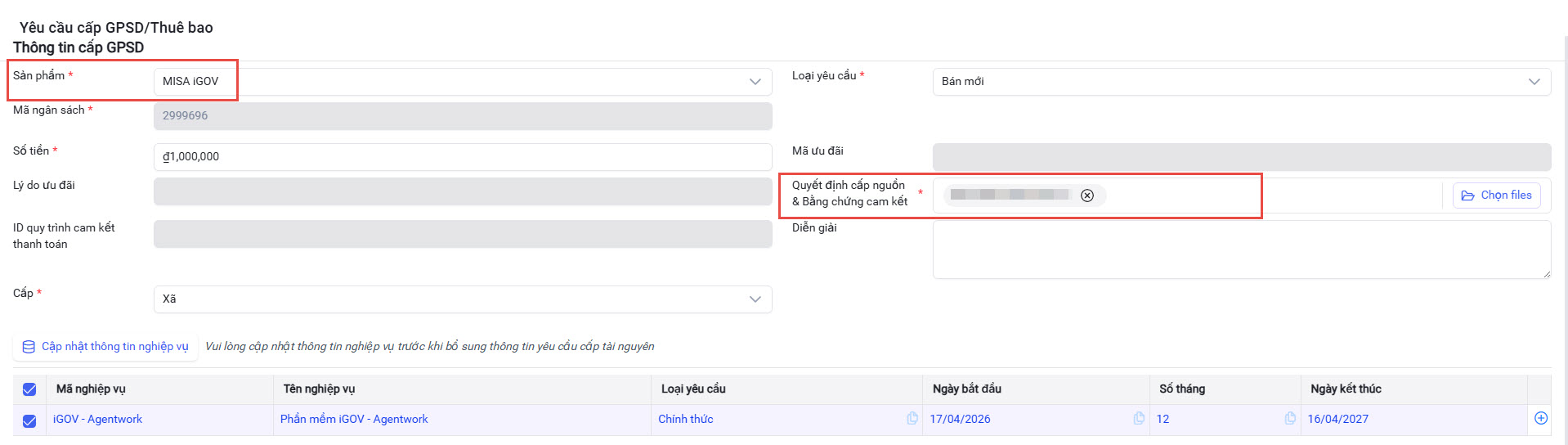 3.1. Lập yêu cầu cấp GPSD/Thuê bao sản phẩm iGOV Agentwork cho UBND Xã/Phường