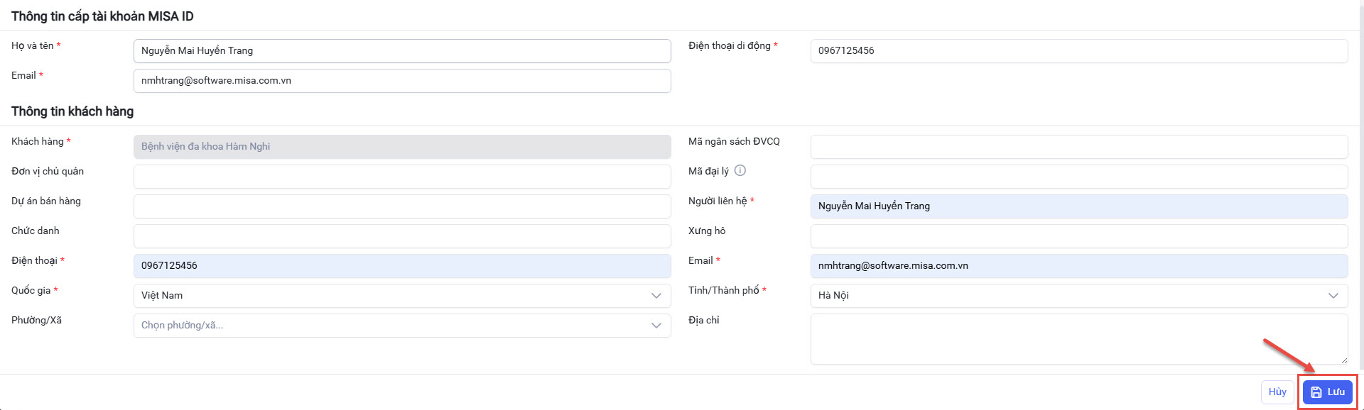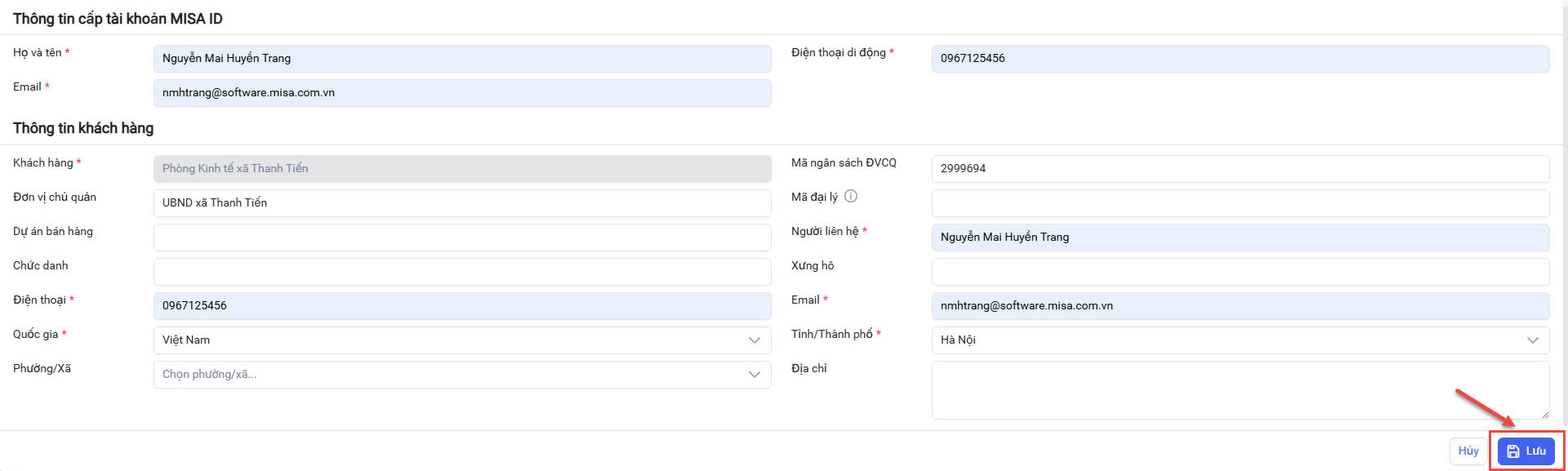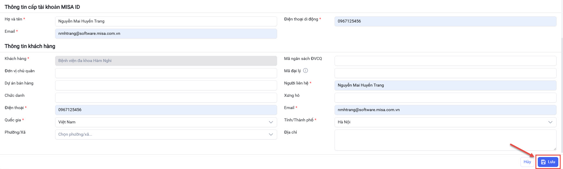 - Sau đó nhập Thông tin cấp tài khoản MISA ID, Thông tin khách hàng => rồi nhấn Lưu.