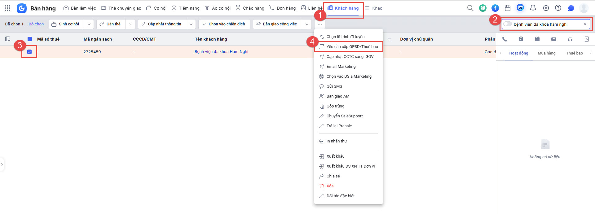 - Anh/chị truy cập phân hệ Khách hàng tại đây và thực hiện tìm kiếm KH theo tên tên KH, mã số thuế, email, địa chỉ,…