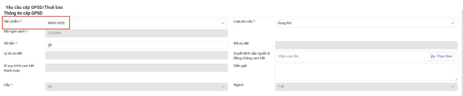 - Anh/chị chọn sản phẩm MISA iHOS => hệ thống tự động lấy ra loại yêu cầu là Dùng thử.
