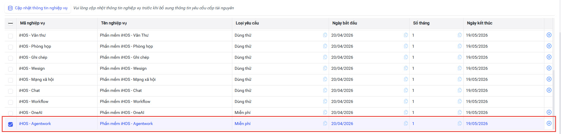 - Tick chọn nghiệp vụ iHOS Agentwork.