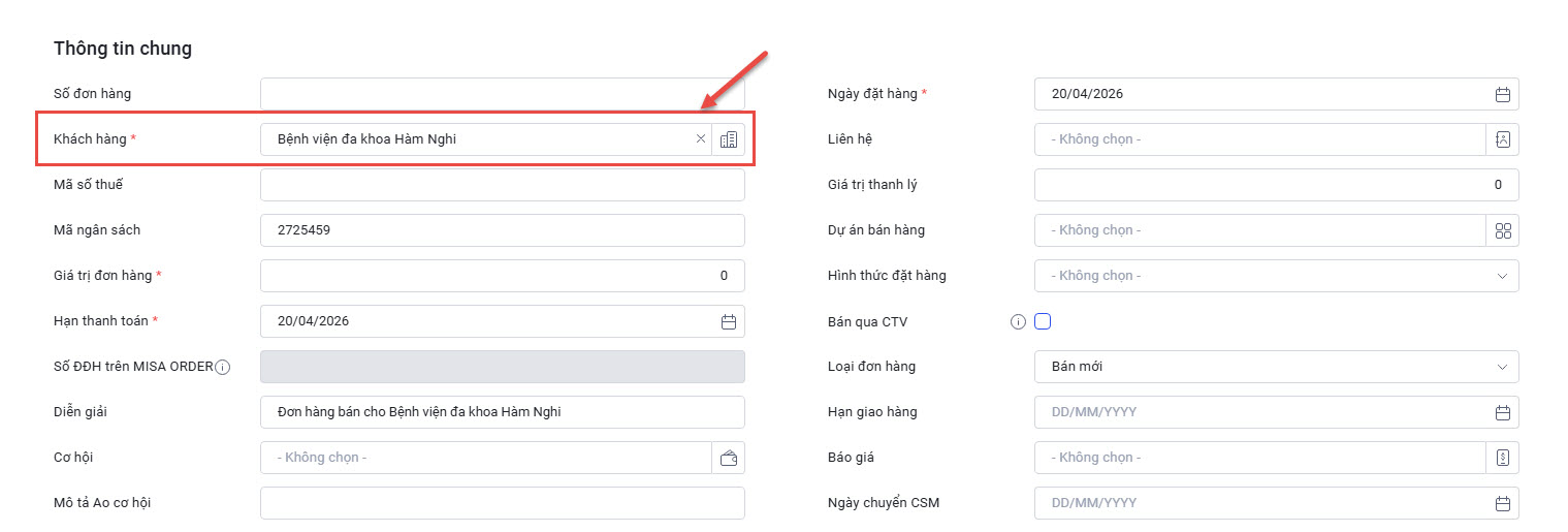 - Sau đó nhập thông tin Khách hàng => hệ thống tự động lấy lên Mã ngân sách.