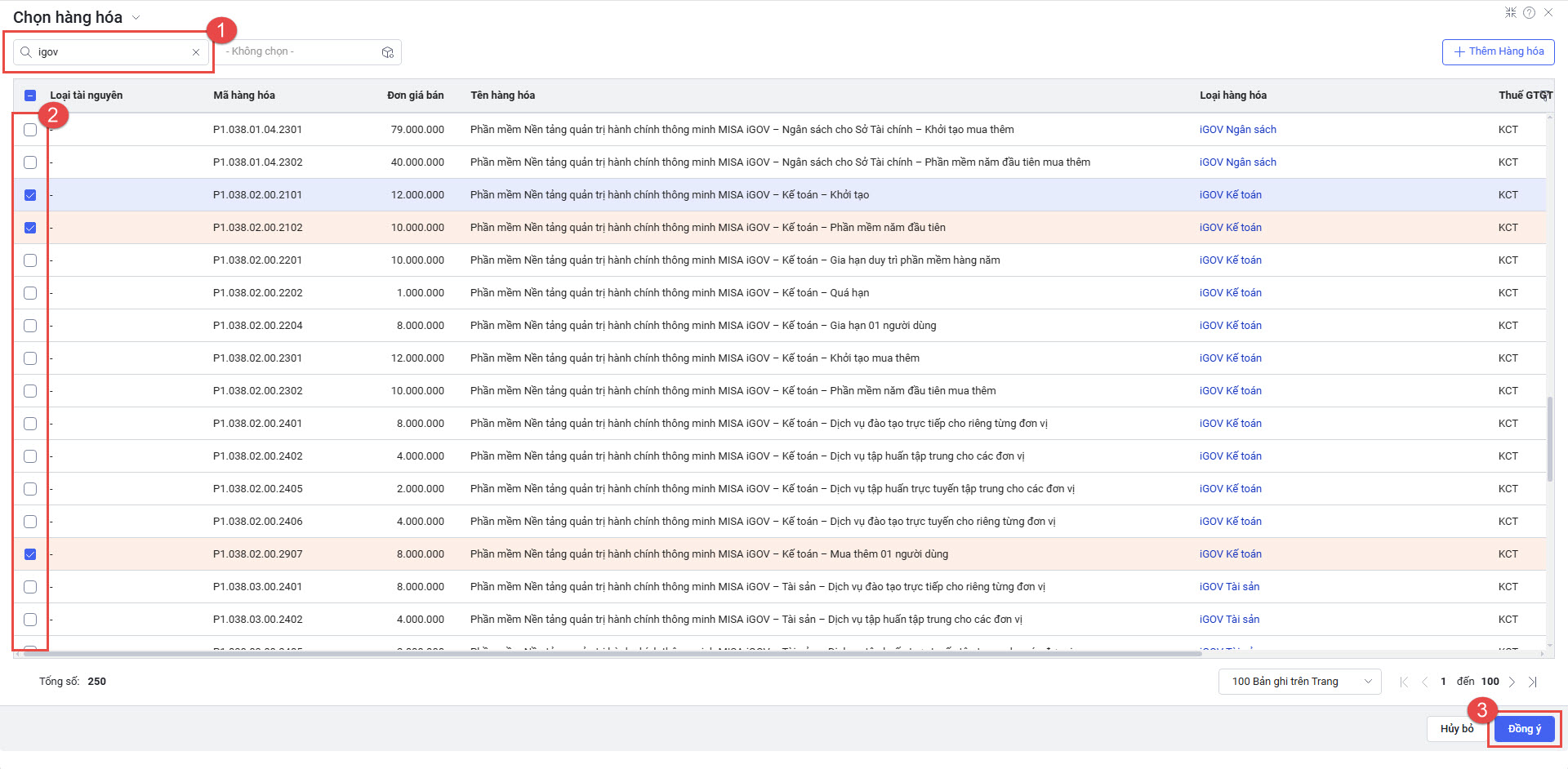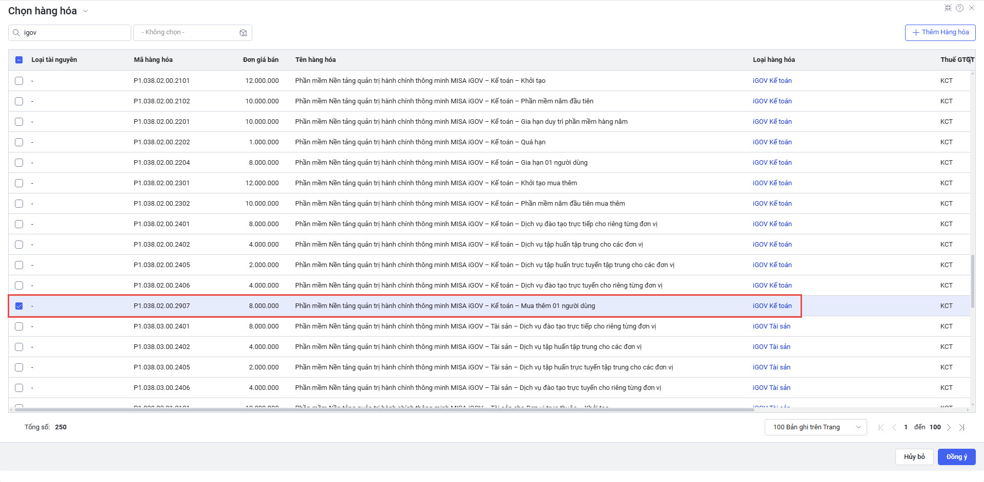 • Tìm kiếm sản phẩm iGOV, tích chọn mã hàng hóa cần mua và Mua thêm 01 người dùng iGOV Kế toán.