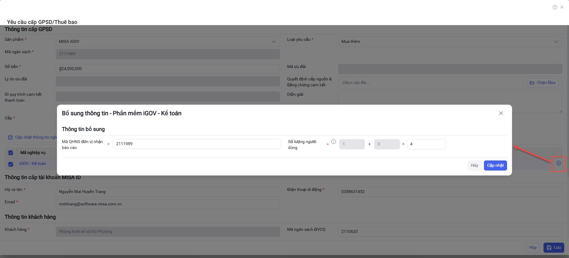 Trường hợp 2: Mua thêm người dùng cho KH đã có thuê bao iGOV Kế toán