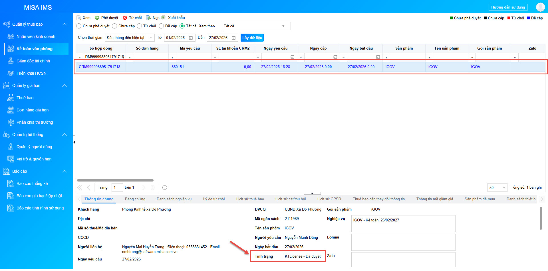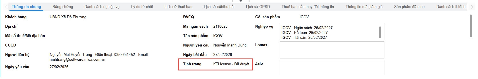 • Sau khi phê duyệt thành công, trong Thông tin chung của thuê bao sẽ hiển thị chi tiết các nghiệp vụ đã cấp thuê bao, Tình trạng đơn hàng sẽ chuyển thành KTLicense – Đã duyệt.