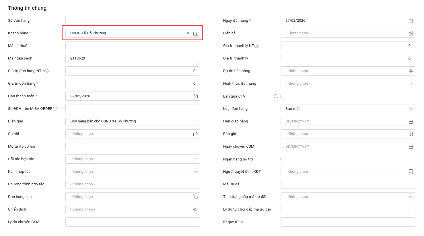 • Khi nhập tên Khách hàng => hệ thống tự động lấy lên Mã ngân sáchDiễn giải và các thông tin liên hệ của KH.