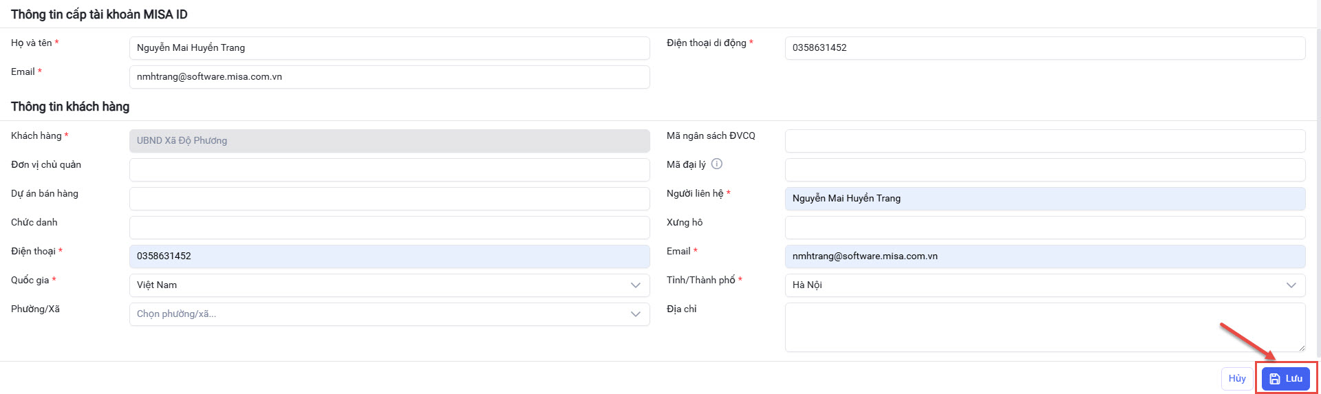 • Nhập thông tin tạo tài khoản MISA ID => nhấn Lưu để gửi thông tin yêu cầu sang IMS chờ cấp thuê bao.