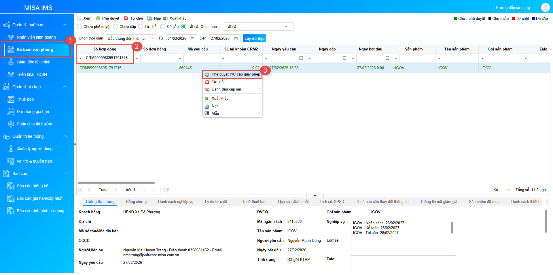 • Sau khi gửi yêu cầu cấp thuê bao sang IMS, hệ thống sẽ tự động cấp và hiển thị trên phân hệ Kế toán văn phòng. KH sẽ được cấp tài nguyên để sử dụng nghiệp vụ mua thêm của sản phẩm iGOV Kế toán đã mua.