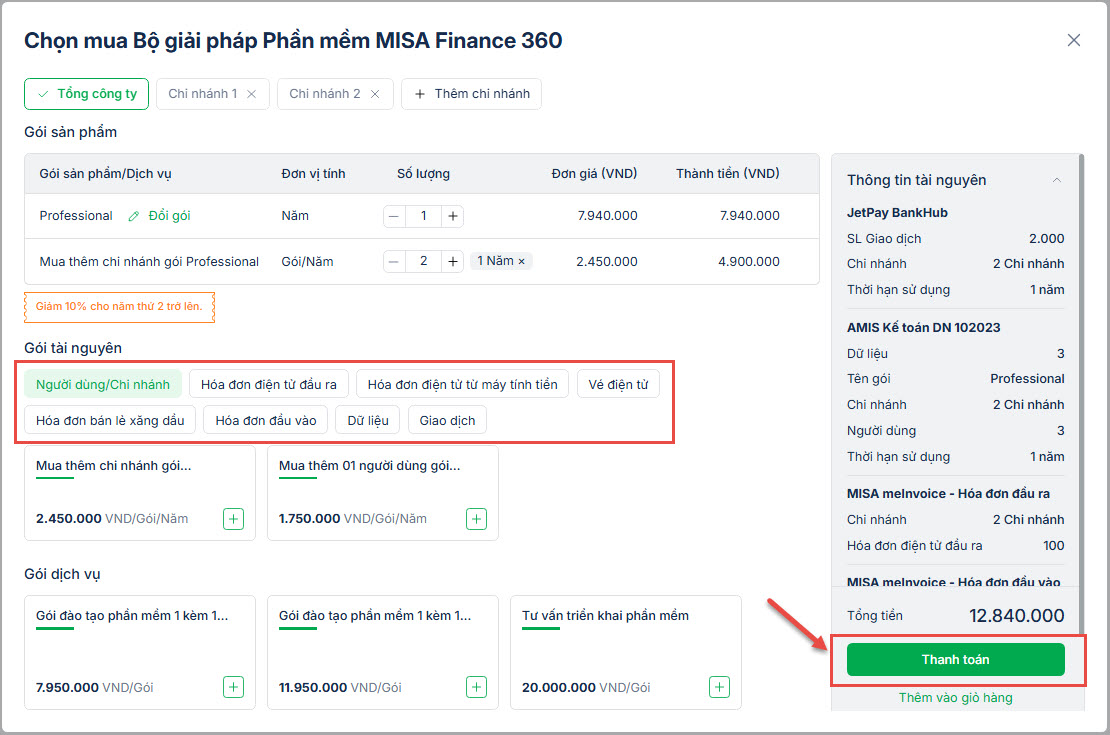 - Anh/chị có thể mua thêm Chi nhánh hoặc Gói tài nguyên, Gói dịch vụ khác.