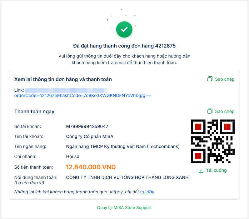 - Đặt hàng thành công, anh/chị gửi thông tin thanh toán cho KH.