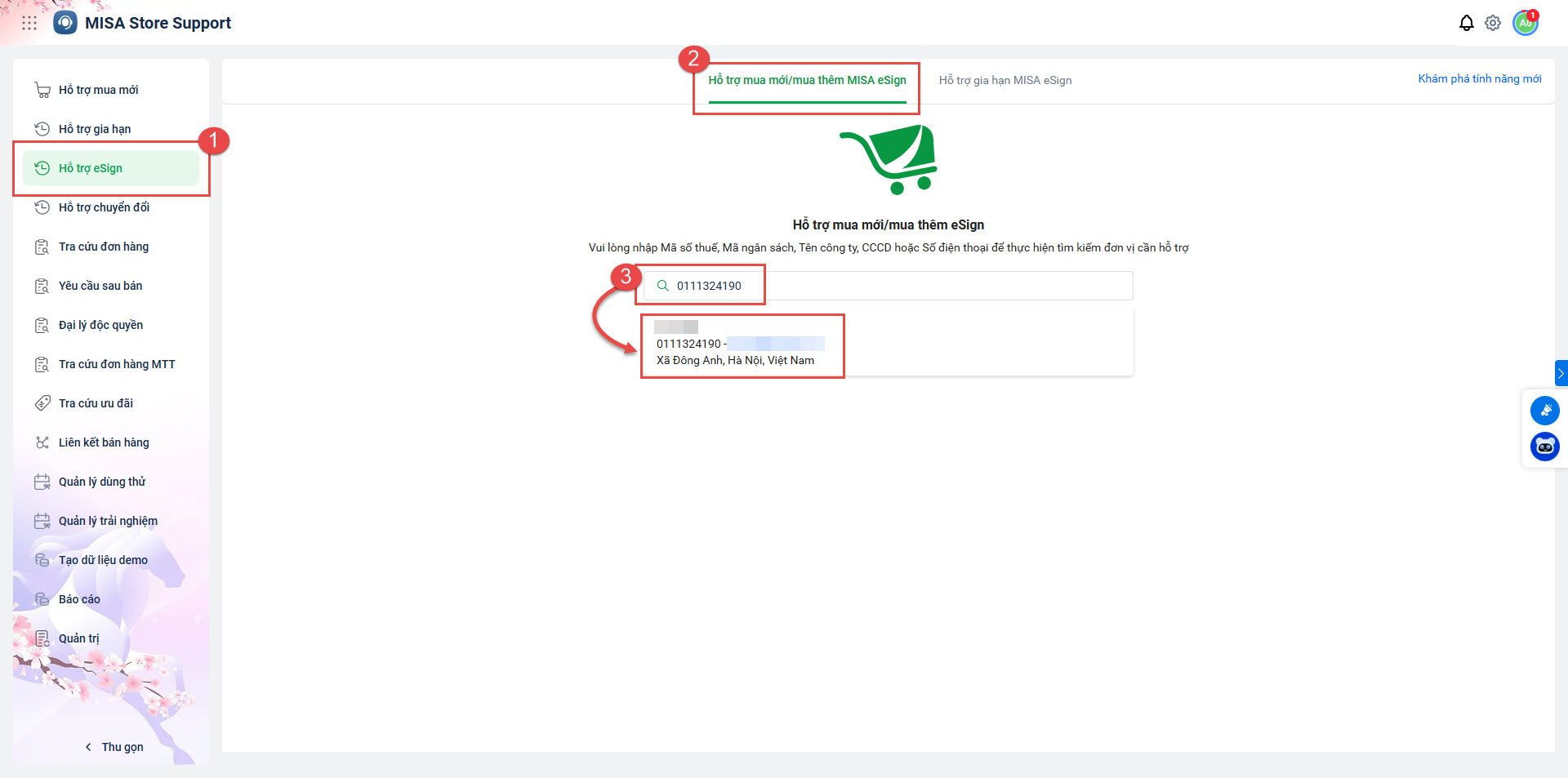 Bước 1: Truy cập Store Support/Hỗ trợ eSign tìm kiếm Khách hàng cần hỗ trợ